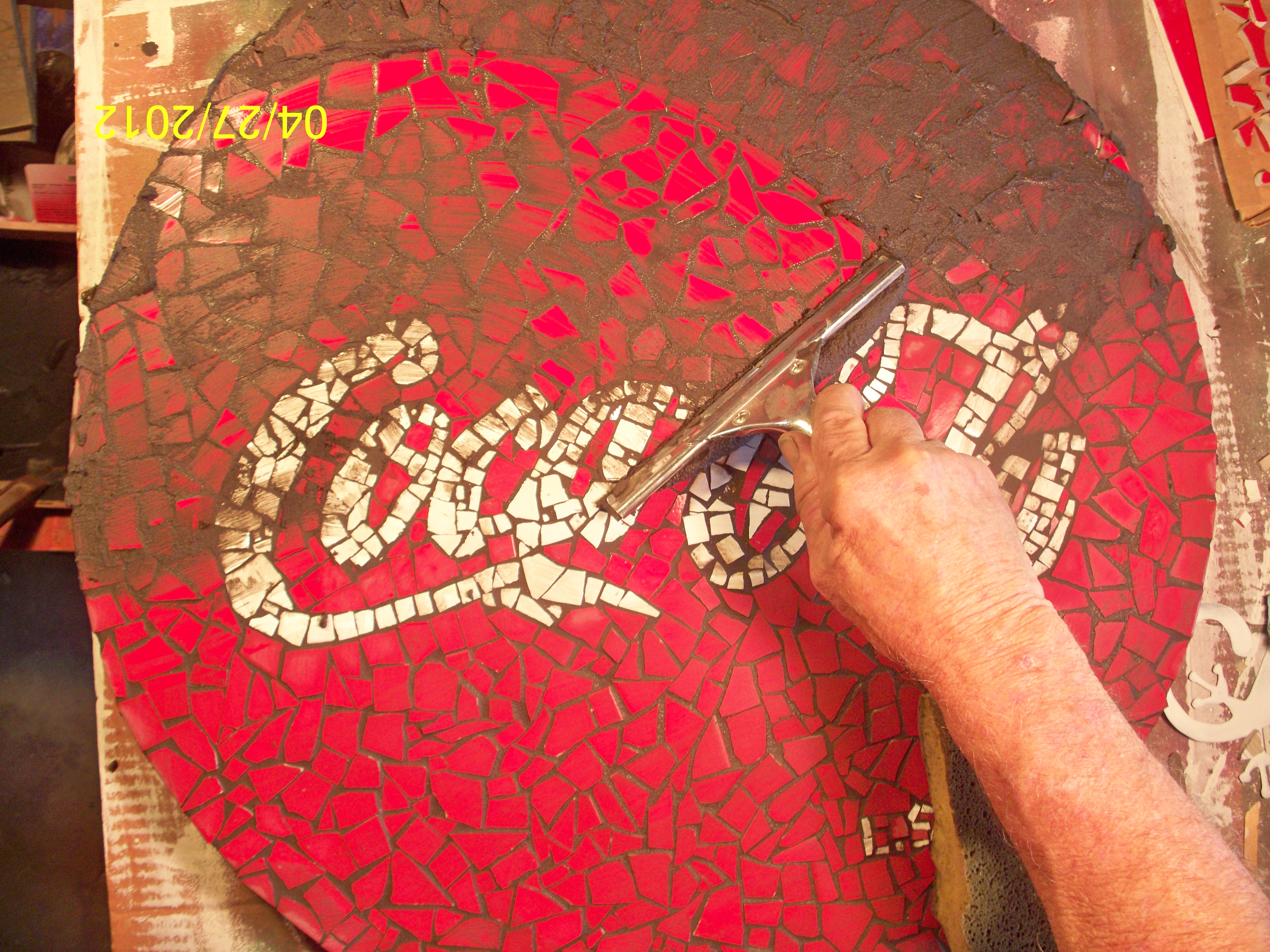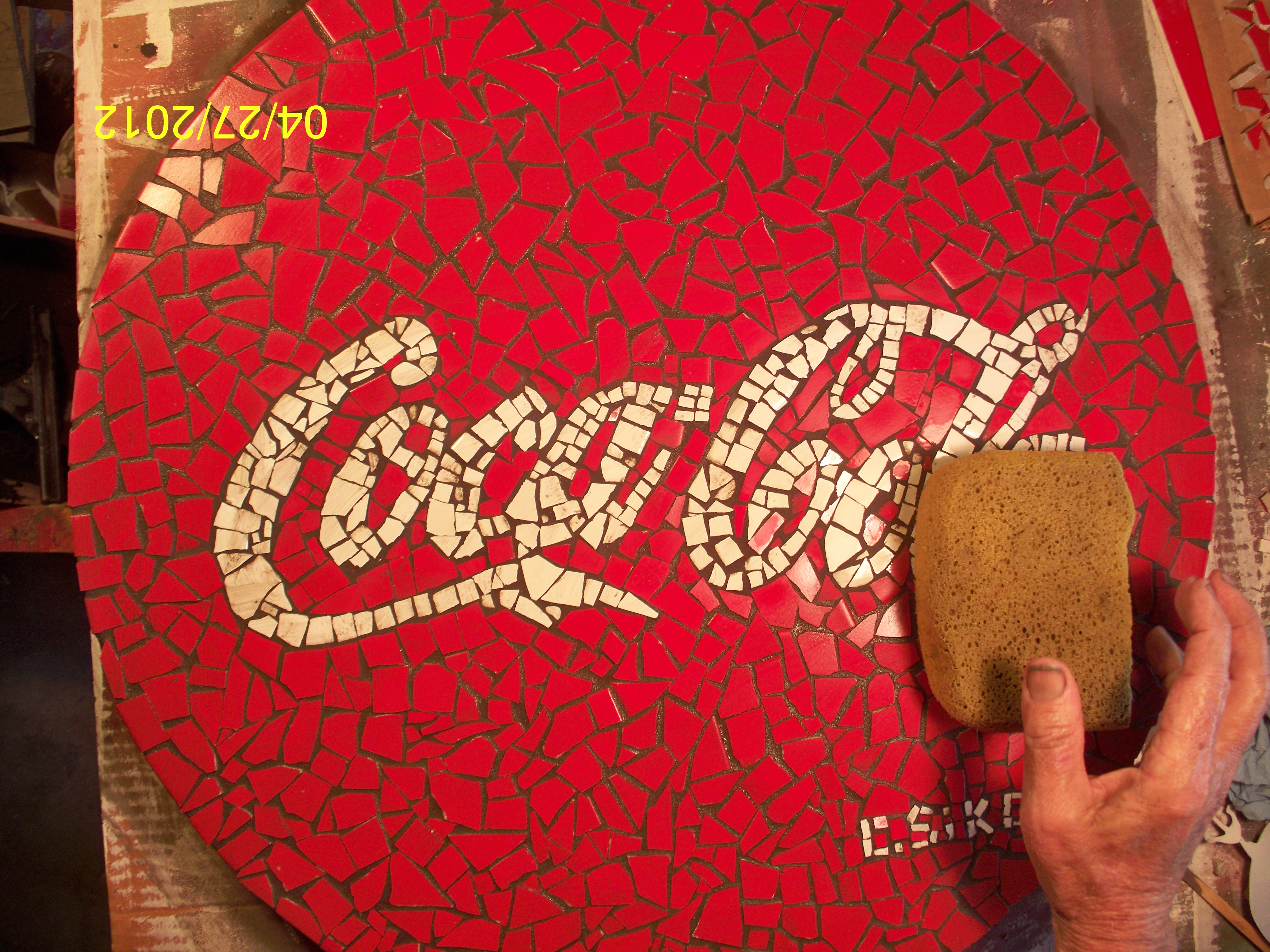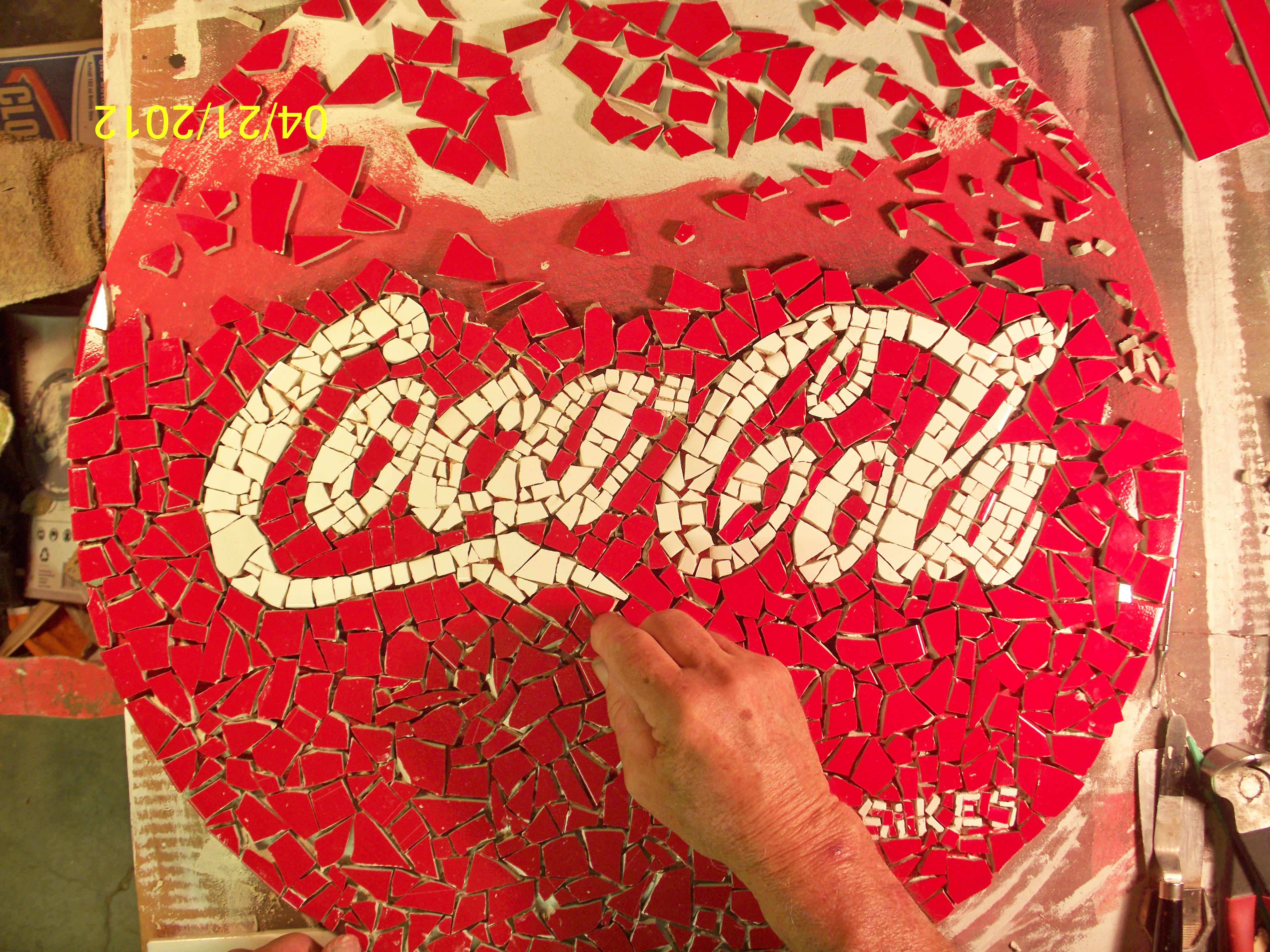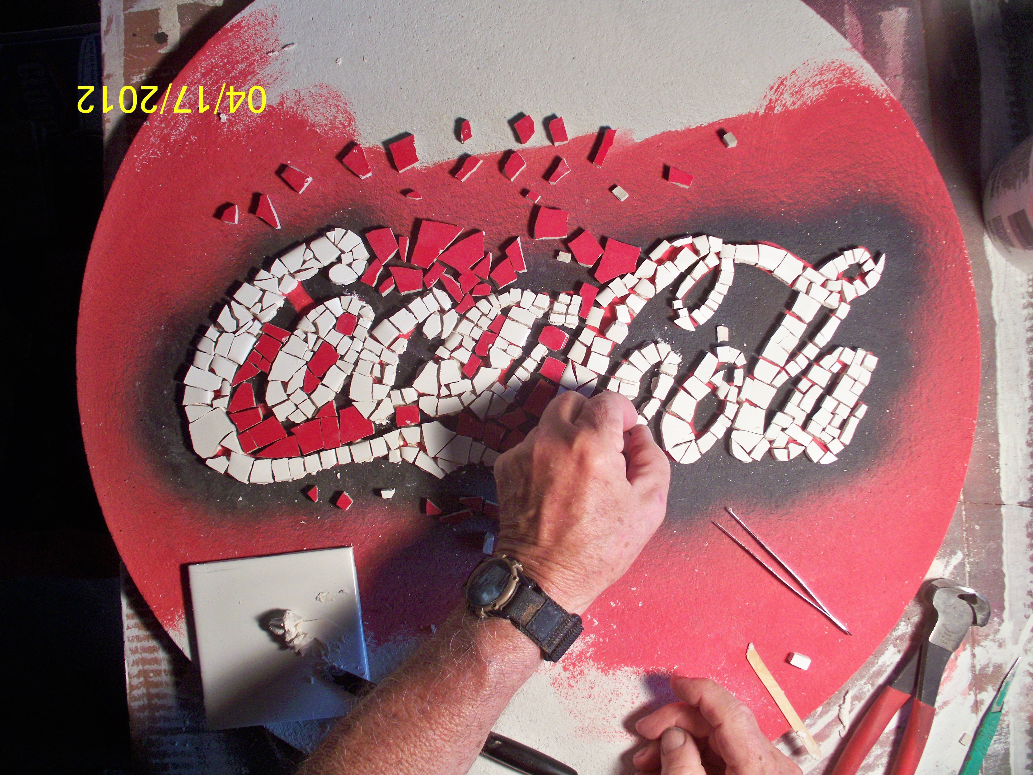 Now the fun part! I made all the pieces for "Coca-Cola" first, using white ceramic tile and cutting as described above. All of these pieces are placed onto my pattern. This can take some time, so patience is a virtue at this point!
