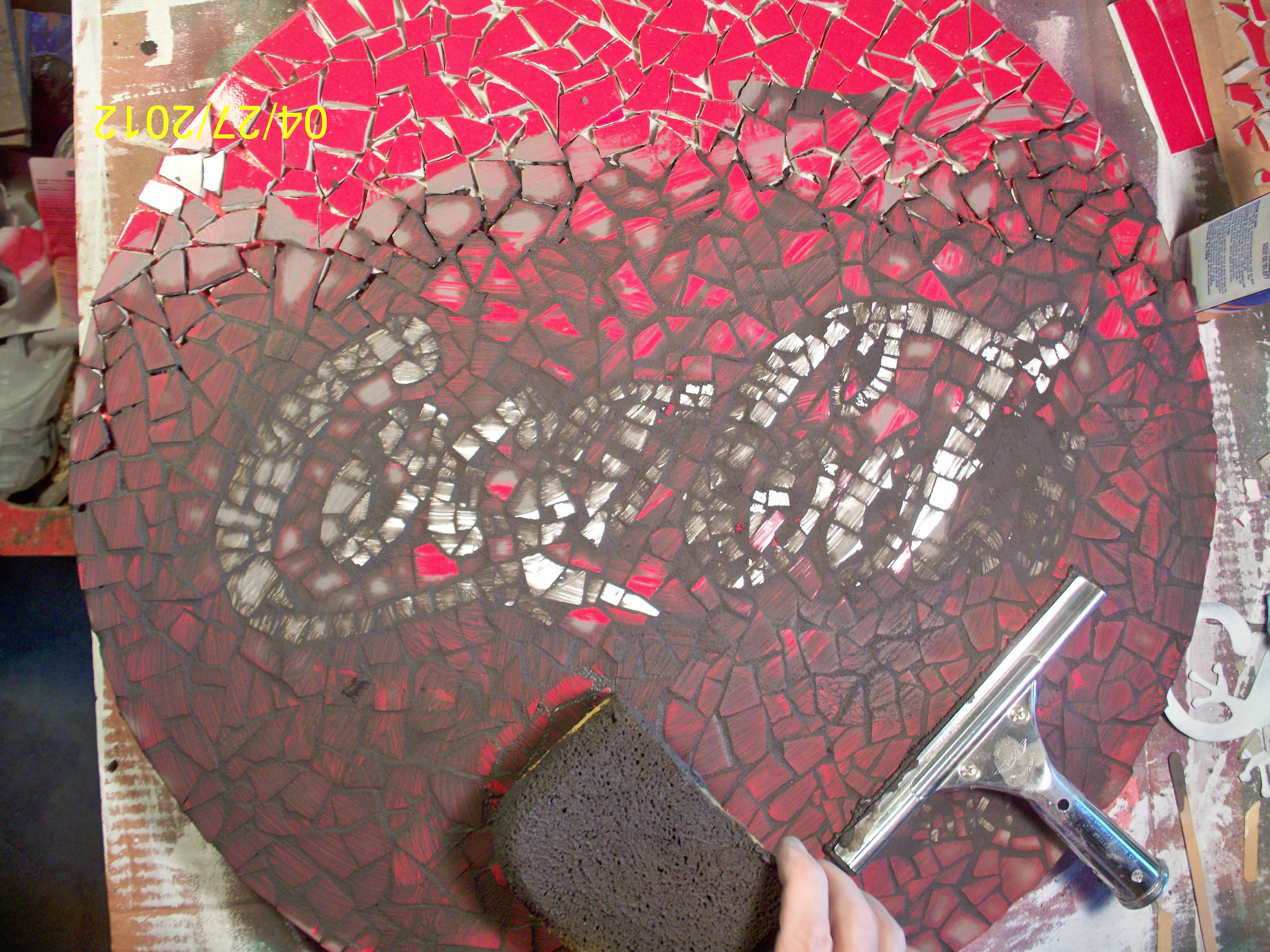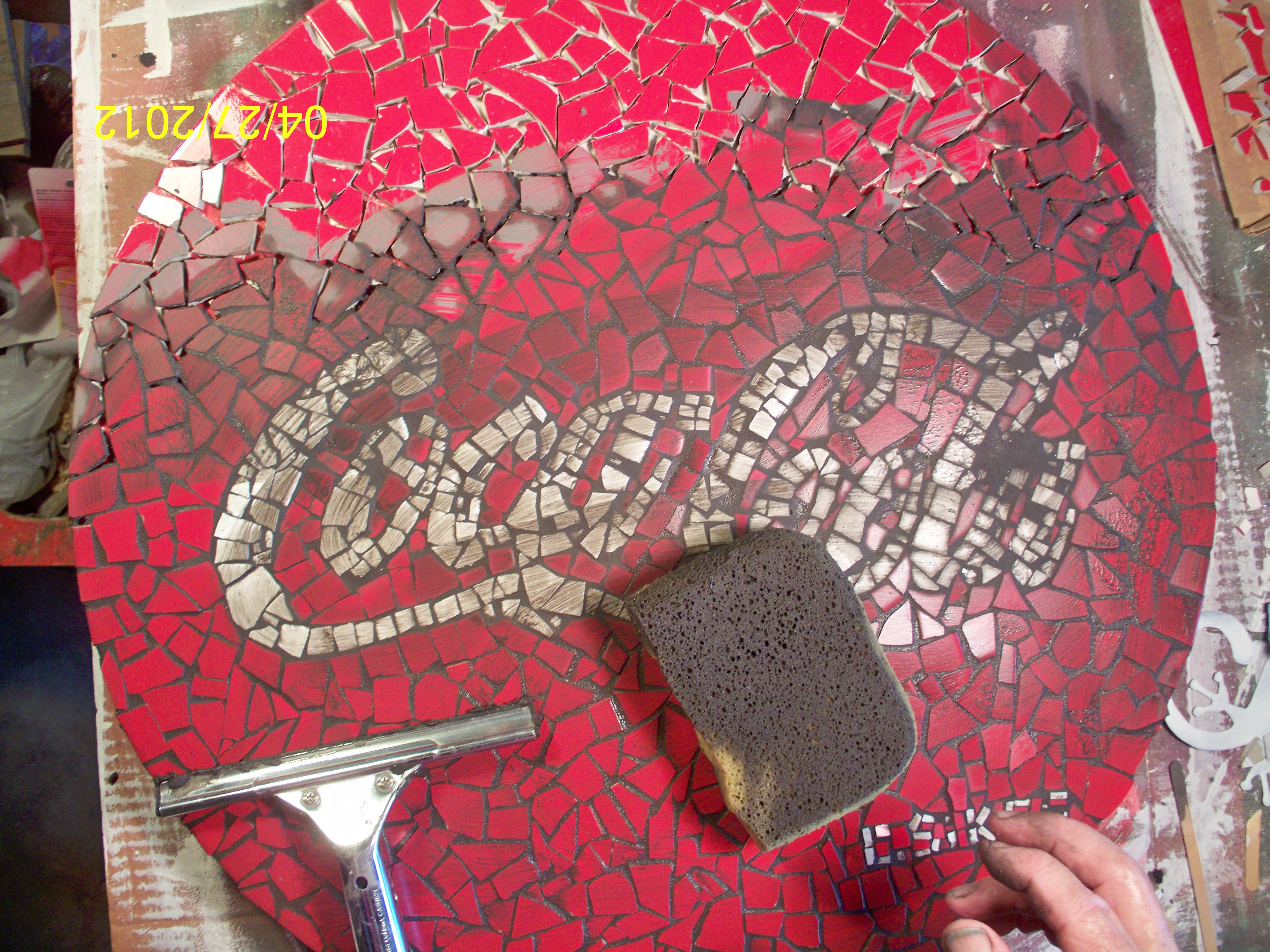 When you first do a mosaic piece and you apply the grout, you worry that you'll never get it cleaned off. But rest assured, the process os cleaning is very effective and will be successful. Excess grout is squeegeed off as much as possible, then a damp sponge is used to wipe remaining grout off. You can wait 10 or 15 minutes to do this wiping, the goal being to leave grout in the spaces between tiles but not leavean excess. A light haze on the tiles is to be expected, but this will clean up in subsequent wipings with a soft, dry, clean cloth.