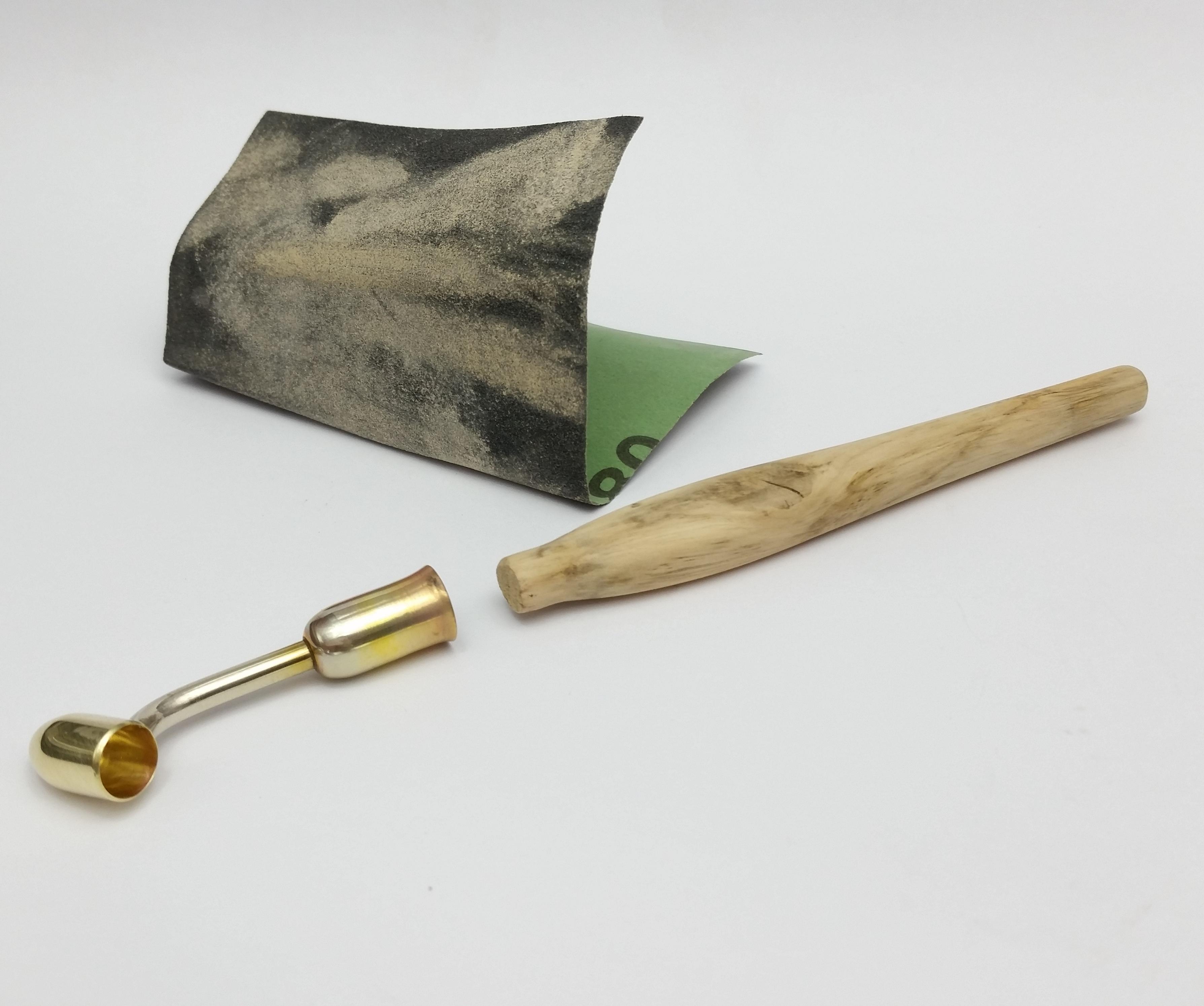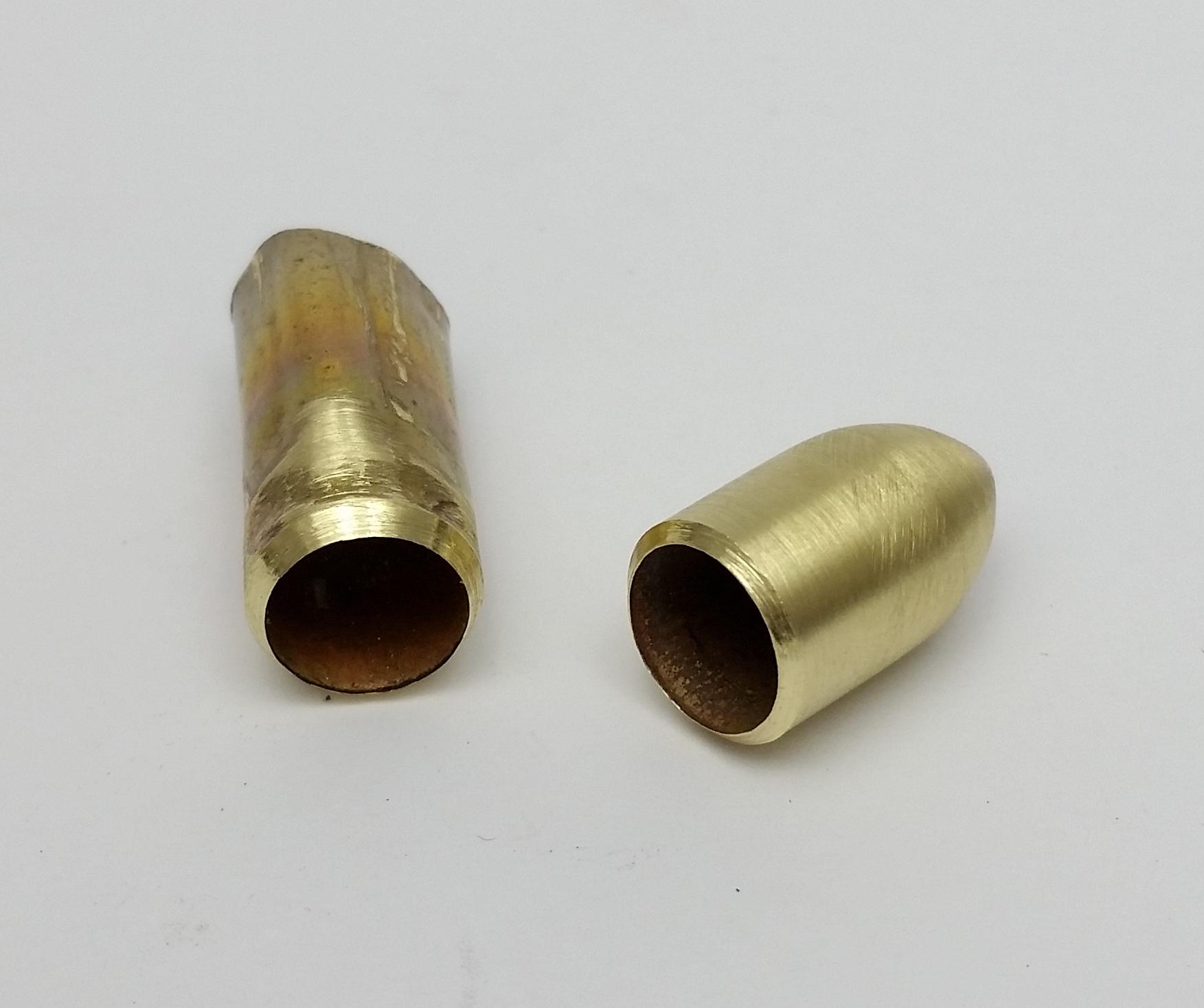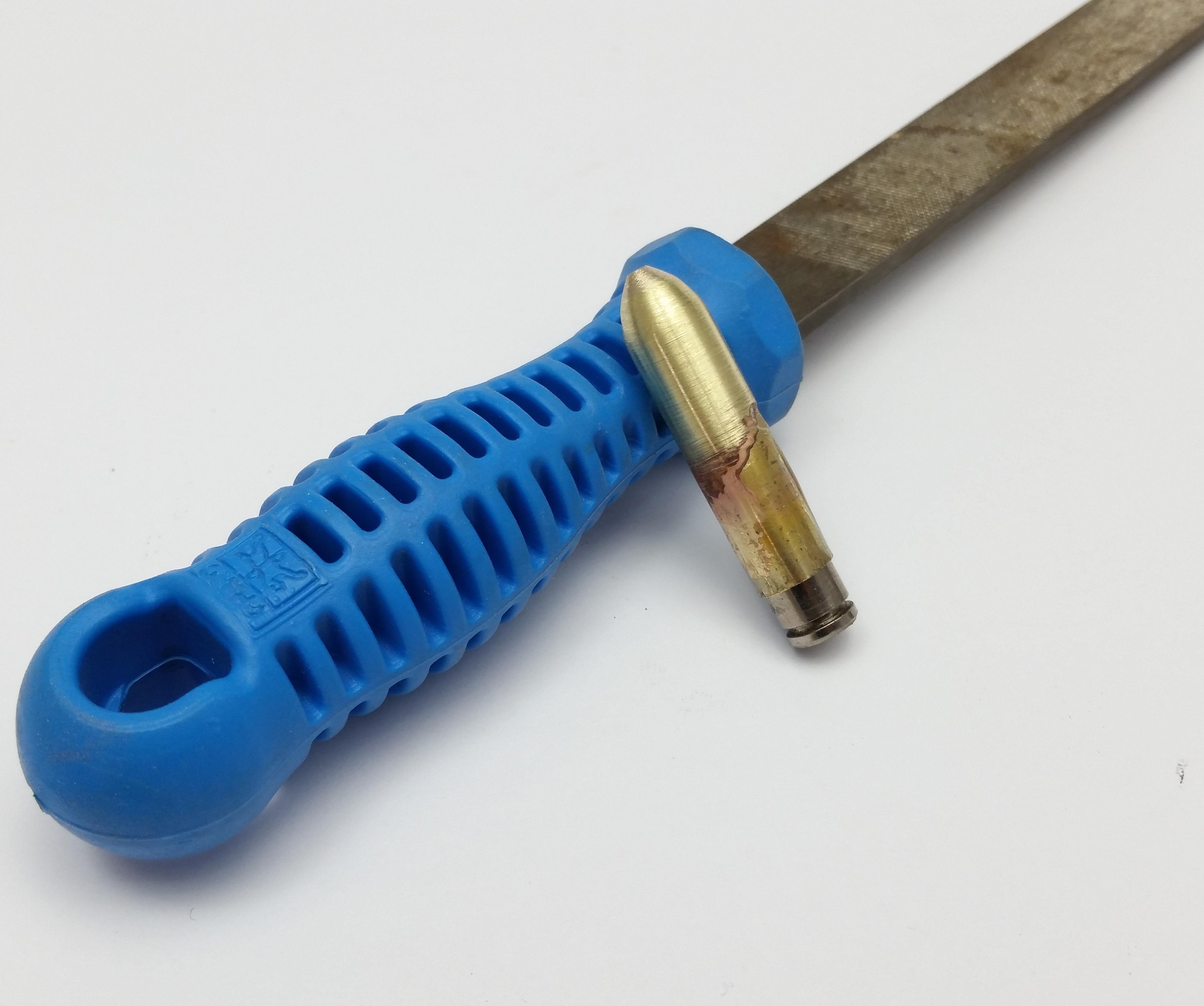 The cup of the handle is made from a spent 9mm casing, I chose the 9mm because of the thinner walls it can easily be shaped for a snug fit around your handle.