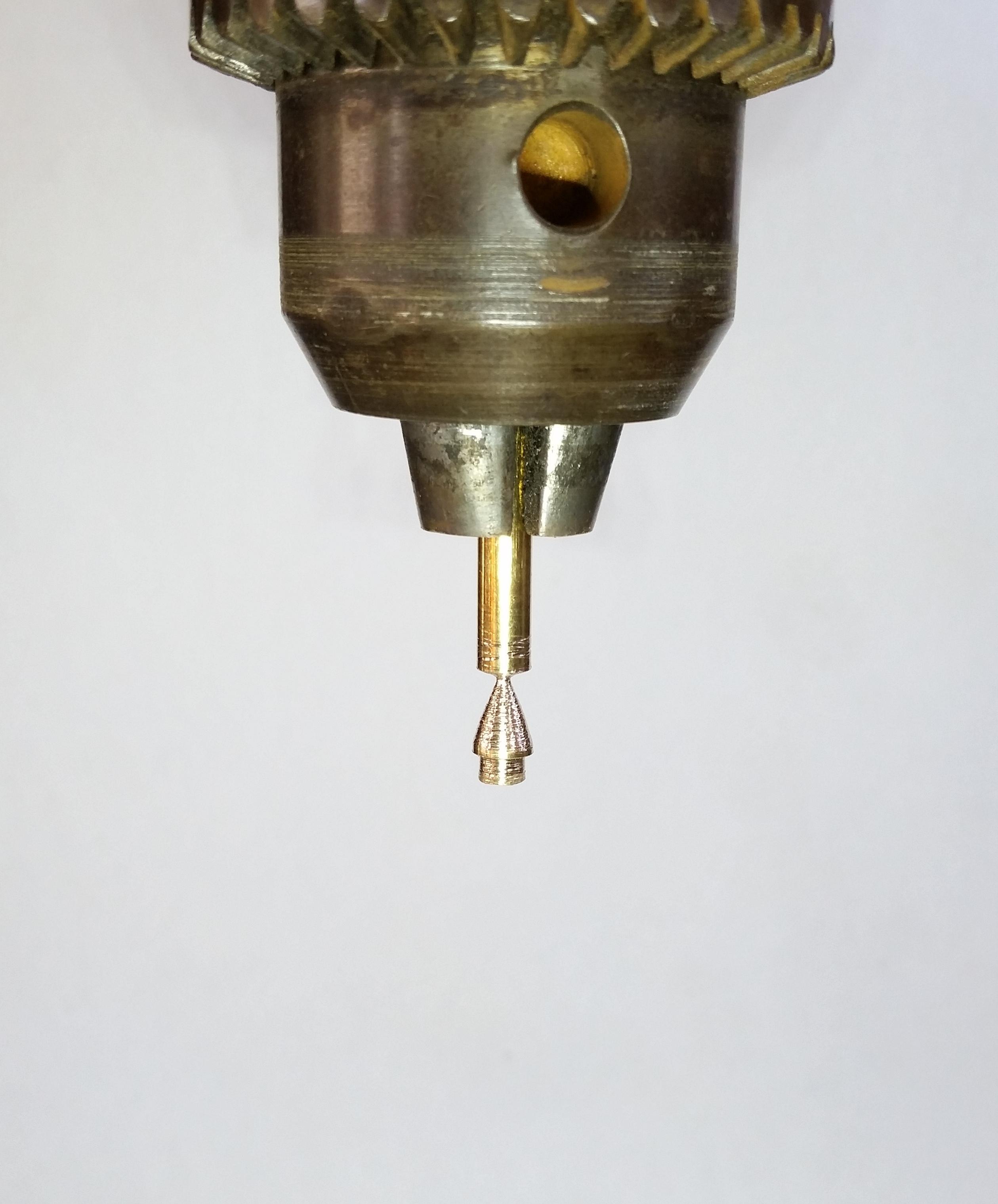 You want the solid point of your cup to be as long as possible because this will be supporting the painting tip, don't worry if the point and case don't match up perfectly as we can simply shape it in the drill again after soldering.