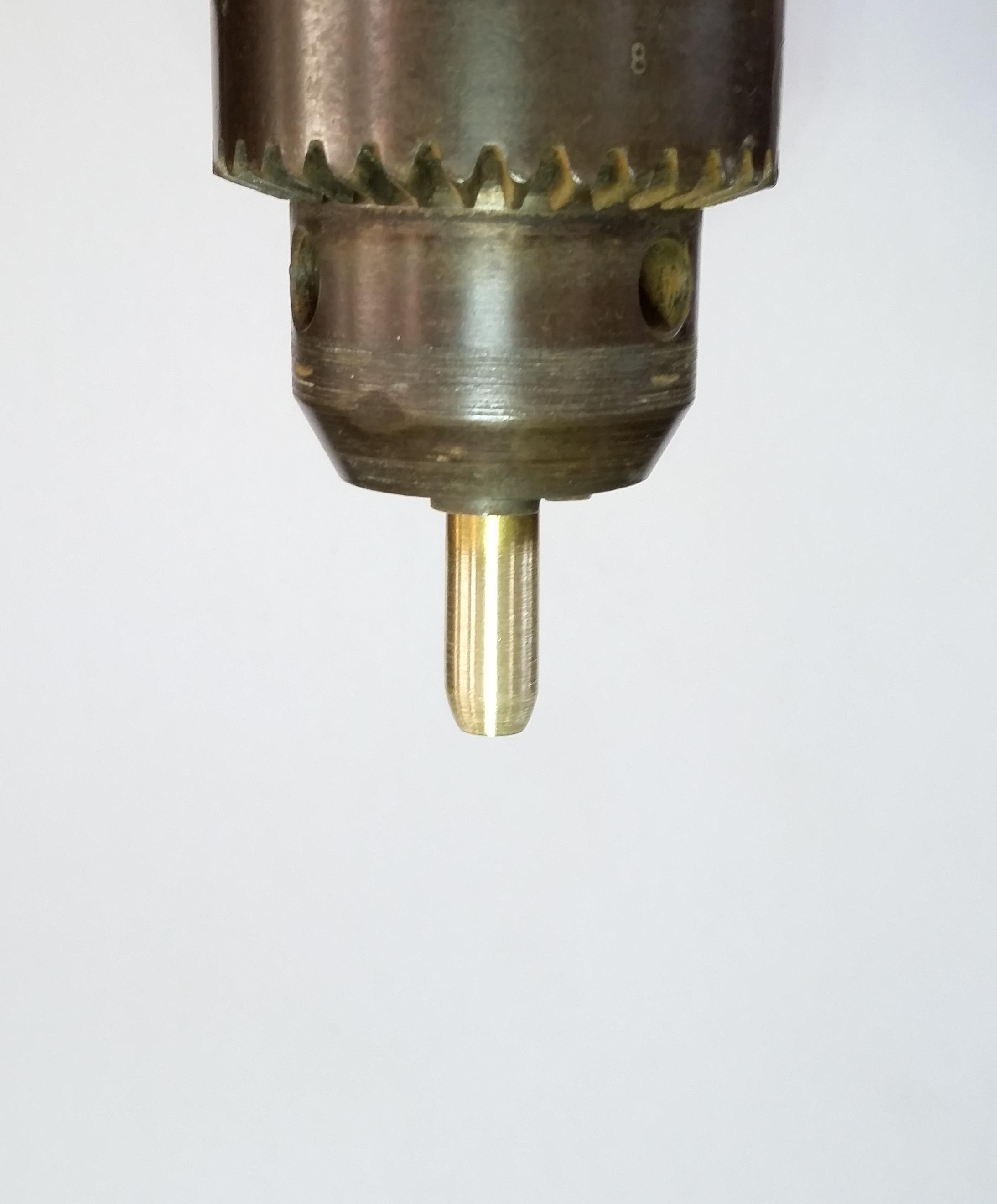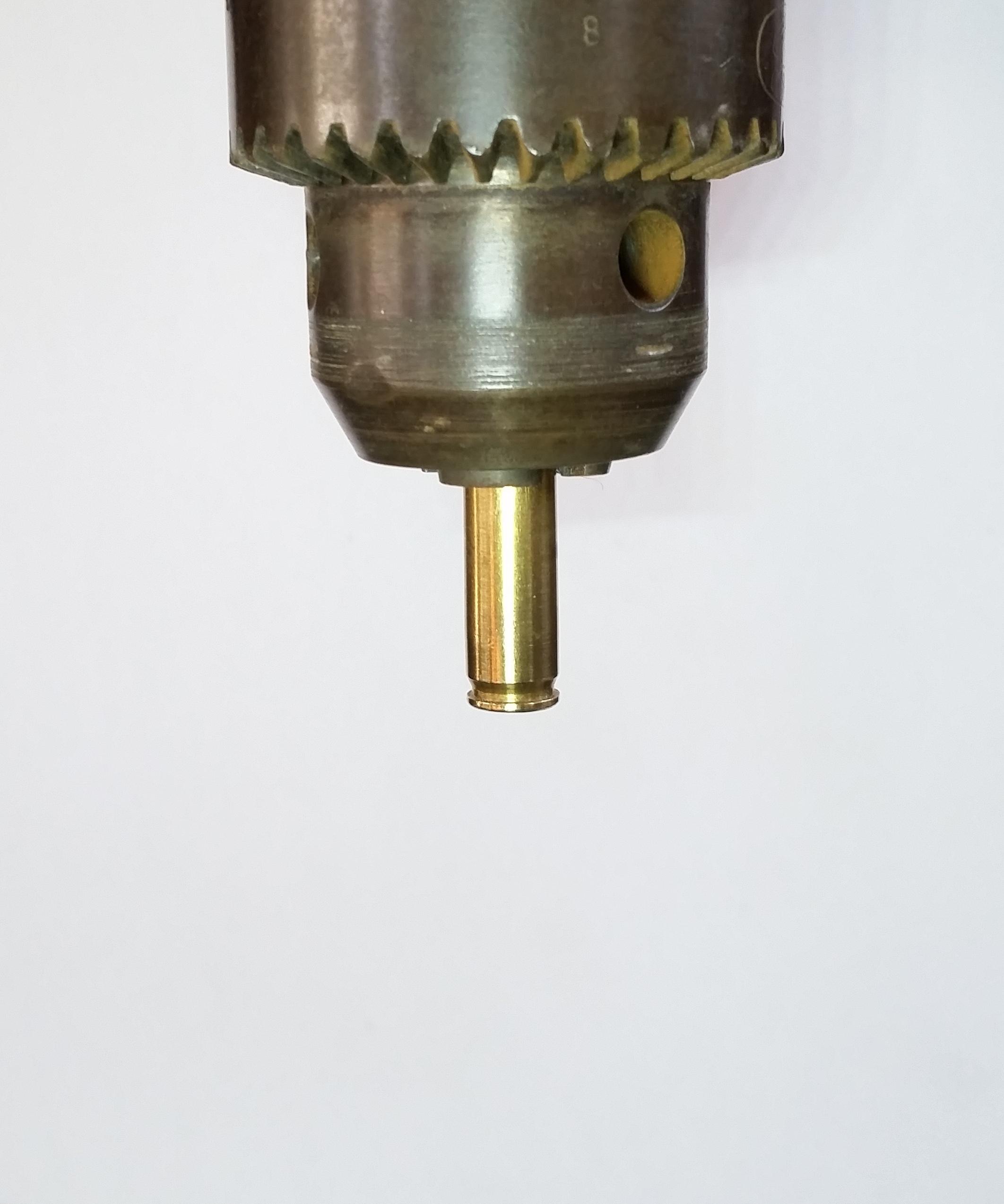 I started by placing the spent .223 cartridge in my drills chuck, to prevent the jaws from disforming the tube when tightening I inserted a dowel inside of the cartridge.