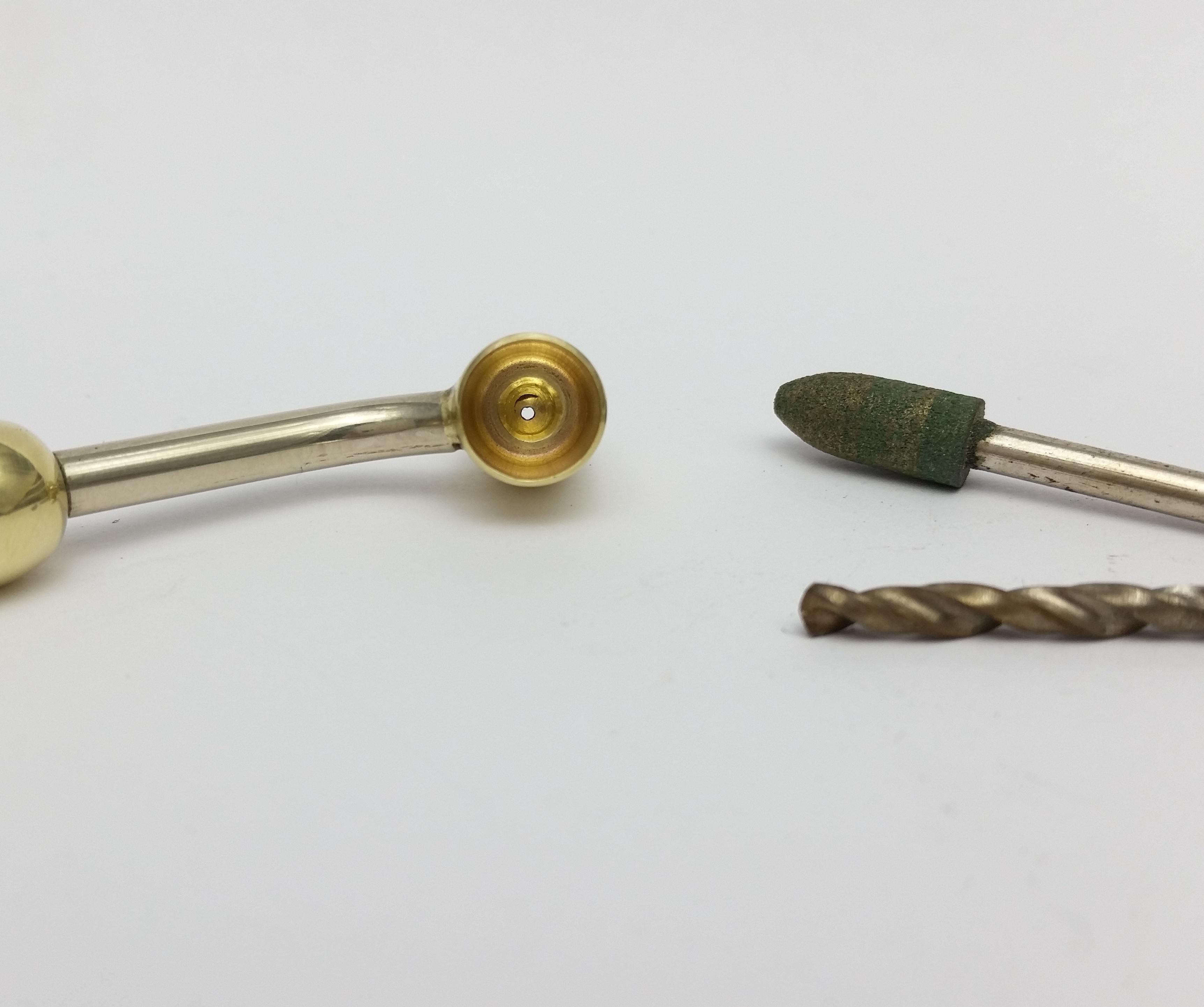 Using a 3mm drill bit I gave the 0.8mm drilled hole a few turns by hand on the inside to create a "funnel" to eliminate any burrs and ridges that can impede flow, next using a rubber compounding bit in my Dremel I polished the inside to ensure a smooth even surface.