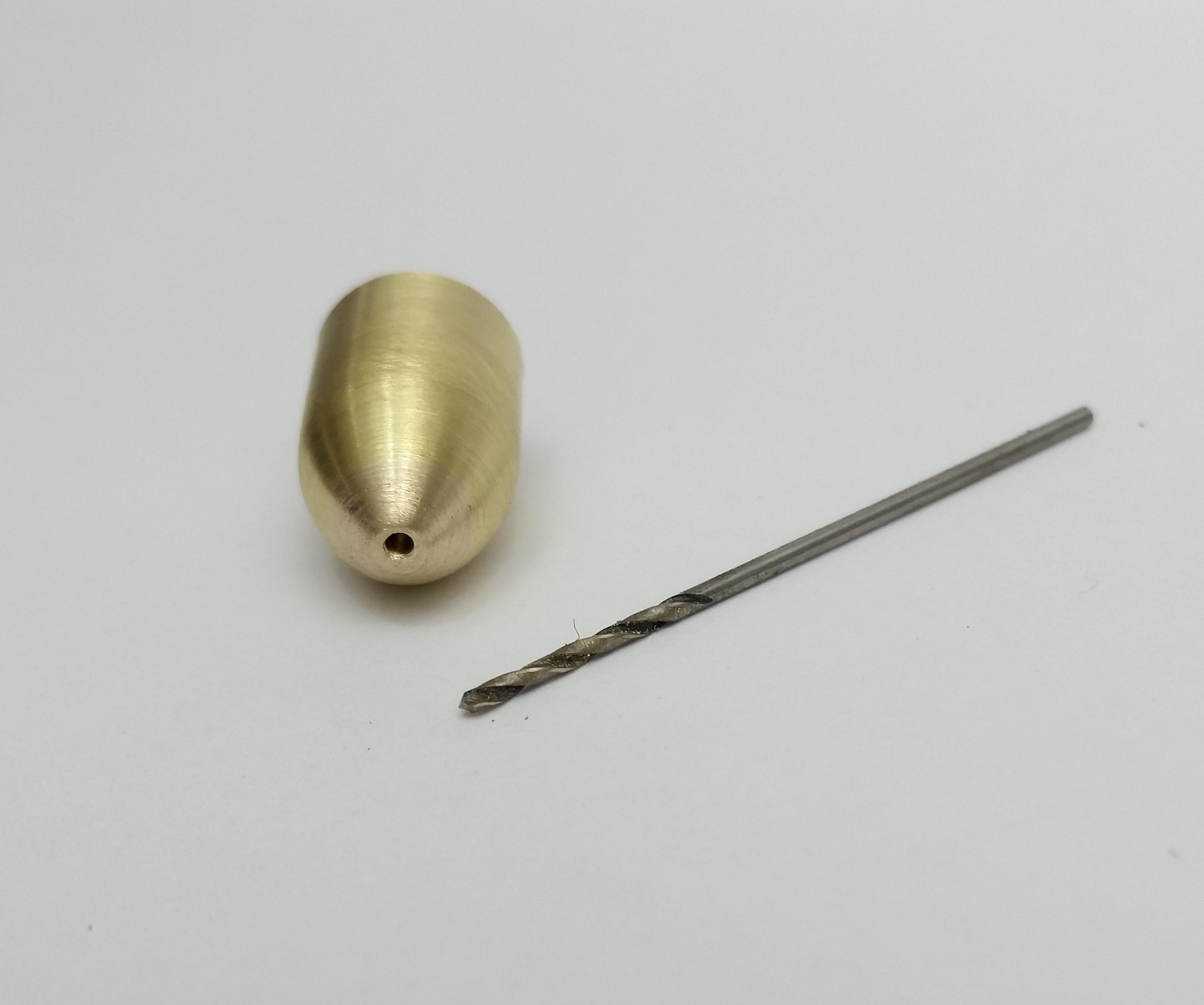 In order to complete the point of the cup we will need to add some additional material, I'm using a piece of 4mm brass rod and by using the drill and file again I shape it into a point with cylinder that fits inside of the primer hole of the spent bullet case.