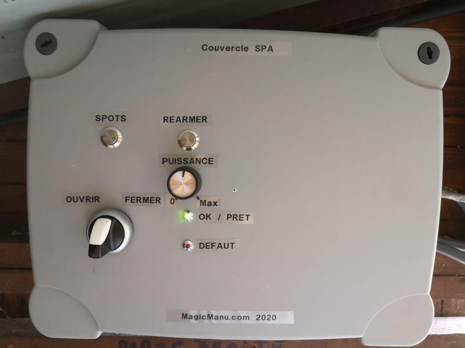 I therefore share my creation with you, an elevated 11 m² terrace, which includes an inflatable 4-seater SPA, 1.8 m in diameter. A hatch allows access to the SPA control (pump, heating, bubbles, etc.) A sliding cover covers it when not in use, it is motorized thanks to a gate motor, it can be controlled from a smartphone or by voice command with Alexa, just like the 4 spots along the wall.