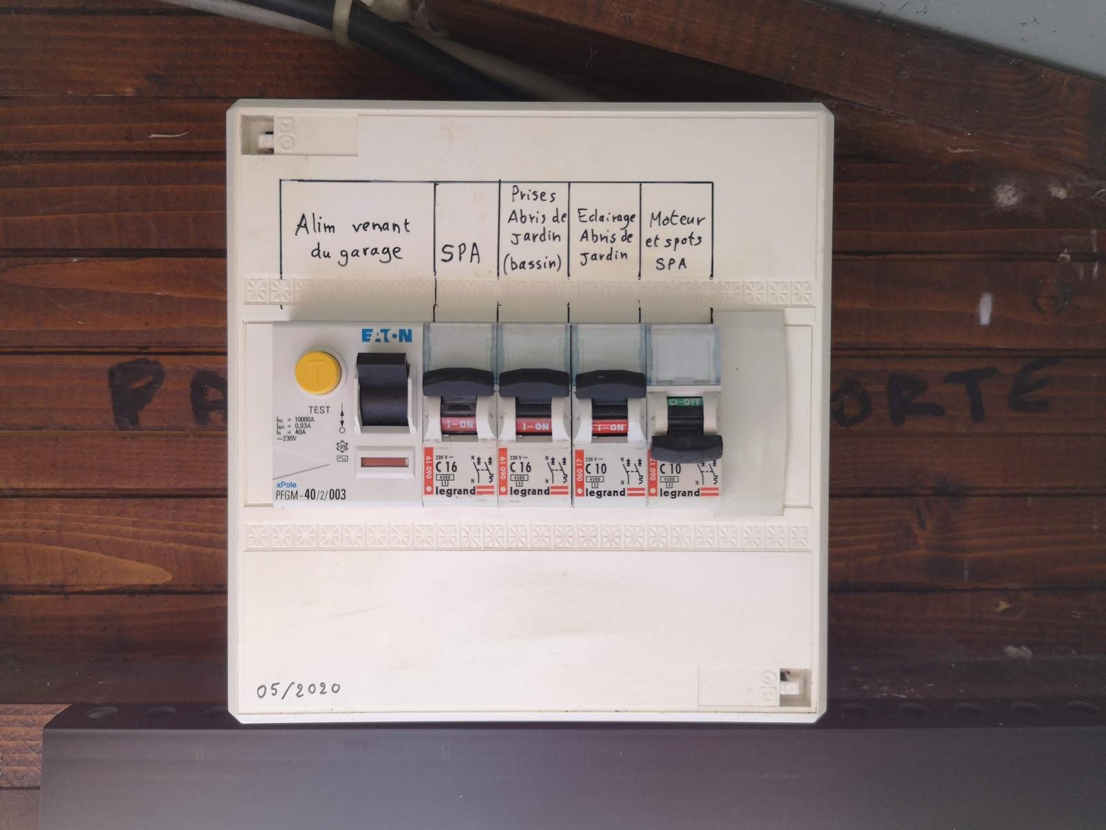 I created protective casings for the engine and for the end of races. I also had to bring back a new sheathed electric cable to power all this (3x4mm²) and create a small electrical panel in the garden shed next to it.