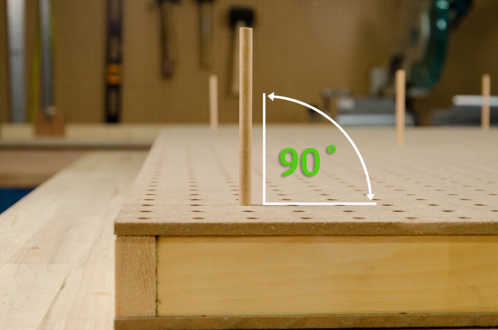 - Stick dowels through both sets of holes, and visually check that they are vertical. Often, fixing a dowel in one spot will make others lean; keep adjusting until they are all as close to vertical as you can get. It doesn't have to be perfect, close is good enough.