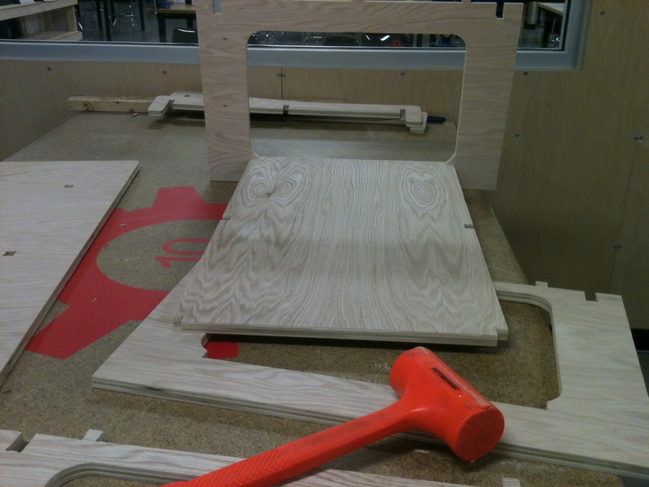 Once you get your pieces out of the waste material of the plywood (not shown) and sanded down the rough edges a bit, you assemble the table by smacking it together with a deadblow hammer. The pieces are (if you adjusted the files for the size of your plywood sheet) made to press fit together. You theoretically won't need nails of glue or anything to hold it together. However, if you notice one of the pieces wandering around you can glue or nail it down. I didn't need to.
