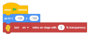 - Set the Tobi sprite’s standing position on stage and switch on the camera feed using the go to x() y() block and the turn ON video on stage with 0% transparency block.