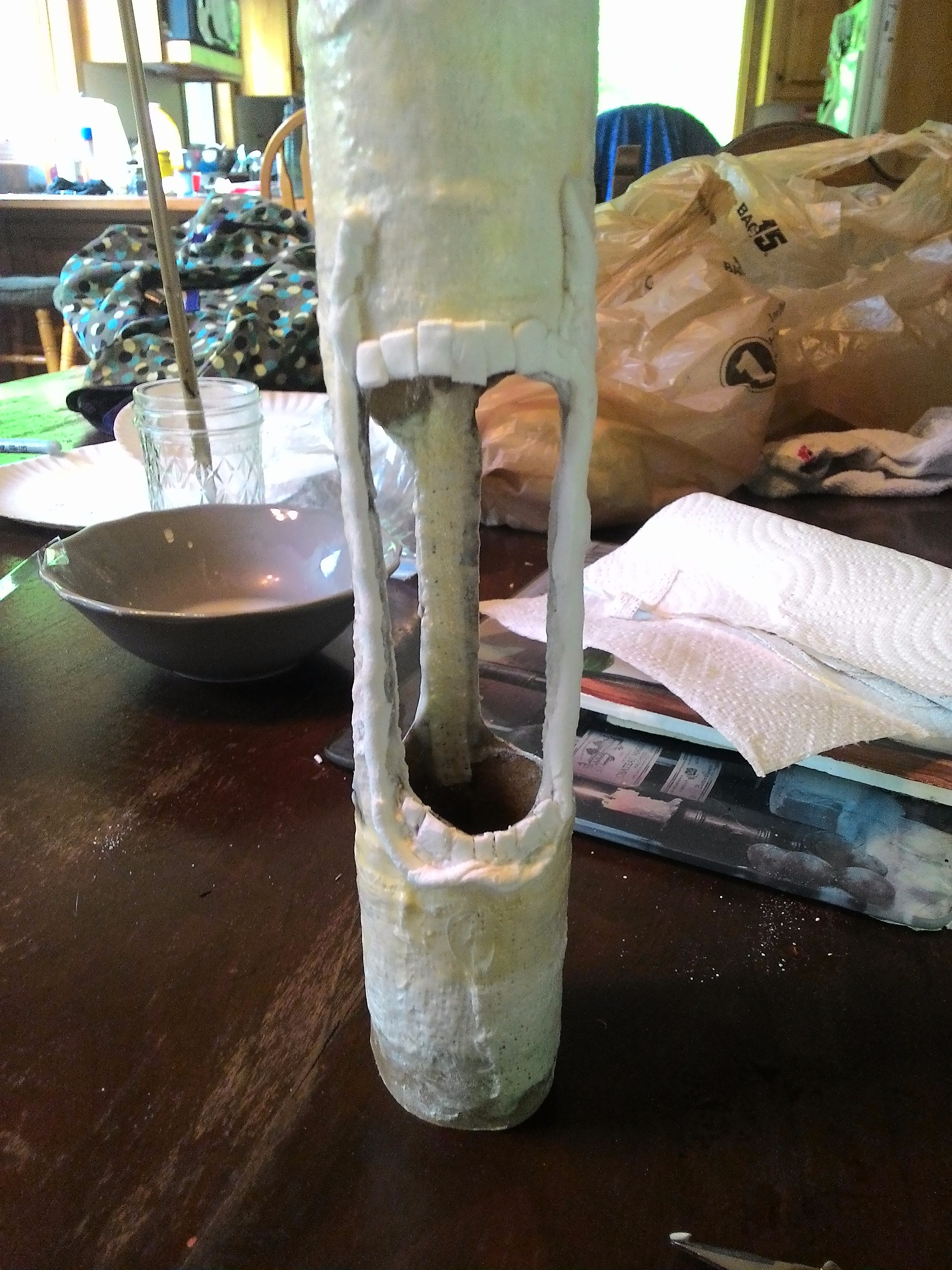 Firstly cut the tube to the appropriate length, and chop the holes out for the mouths. Because paper towel tubes are about as sturdy as, well, a paper towel tube, I covered it in plaster gauze and hung it from my ceiling fan, so that gravity held the thin mouth side thingies, not collapse .