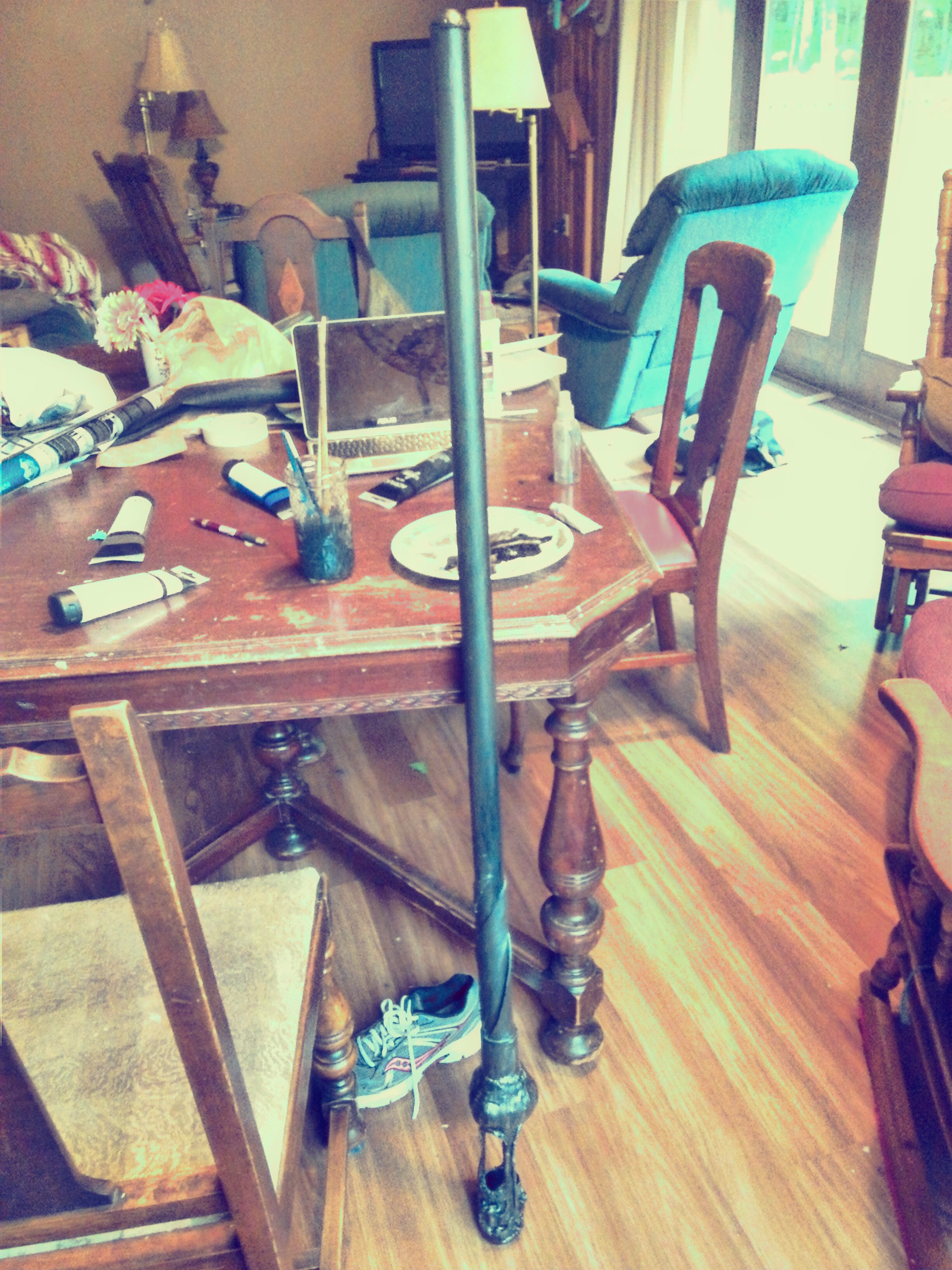 Is pommel the right word? Well, the end of the staff thingie. In the game the end kinda flares out a little, but I don't have time for that, so instead I took a tablespoon measure-er, coated in it a cooking spray (VERY IMPORTANT), and filled it with hot glue. I then attached the glue hemisphere to the end of the PVC pipe with more hot glue.
