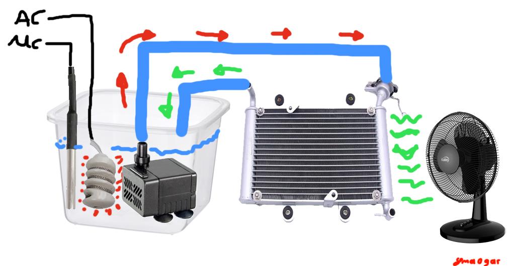 Lo primero a tener en cuenta es que el flujo de agua es un circuito cerrado desde el deposito hasta el radiador, y el agua regresa de nuevo al deposito.