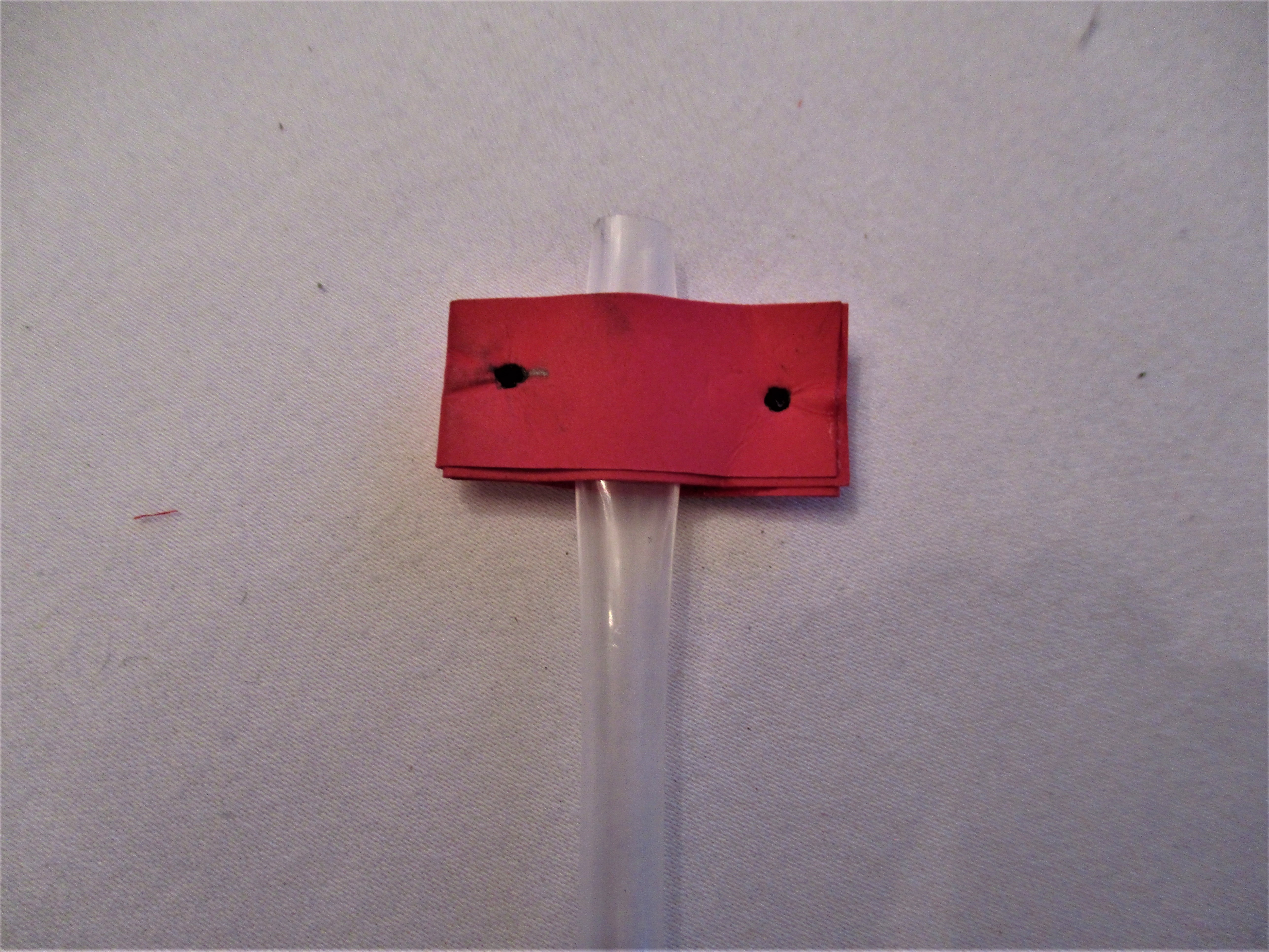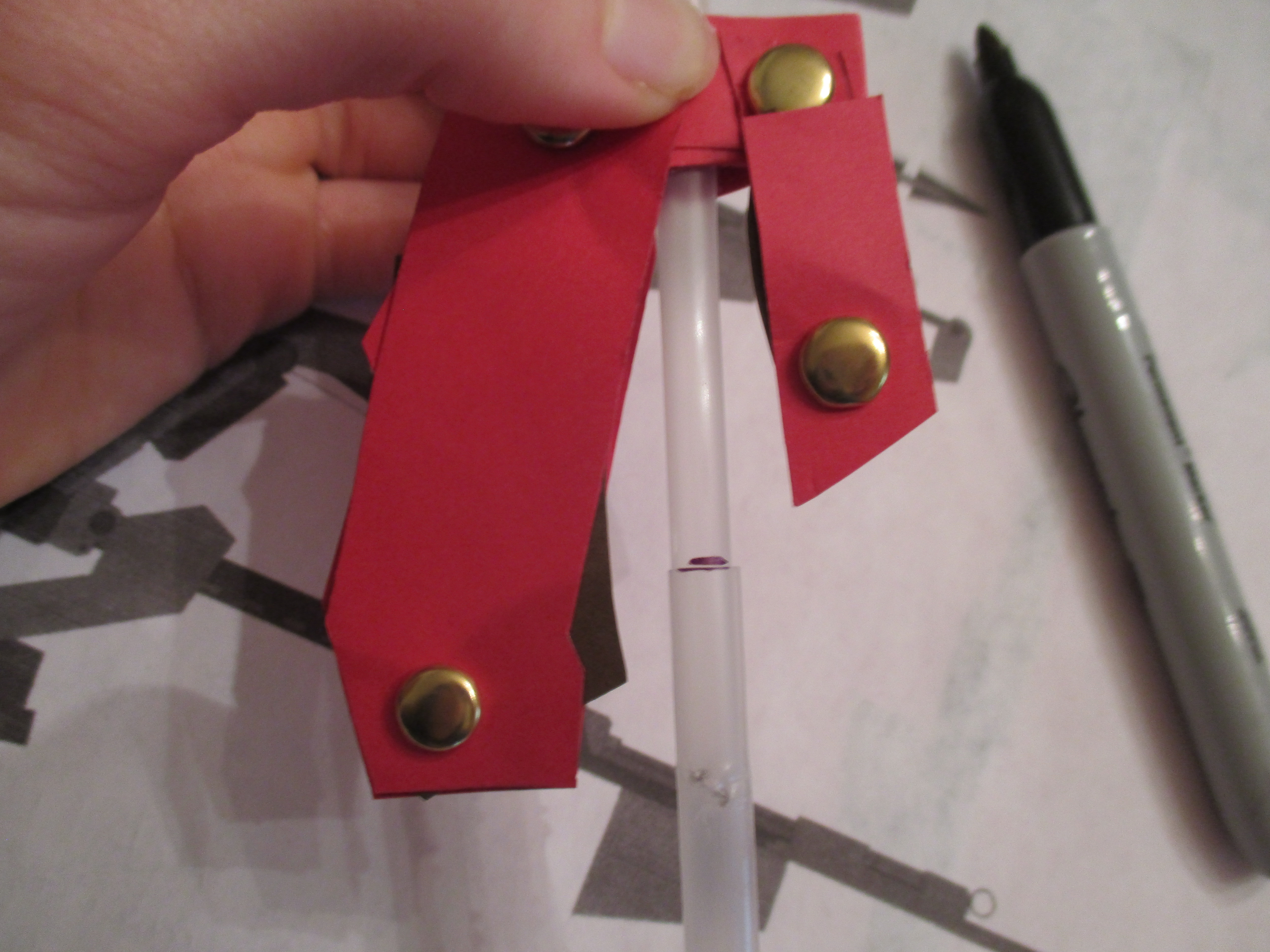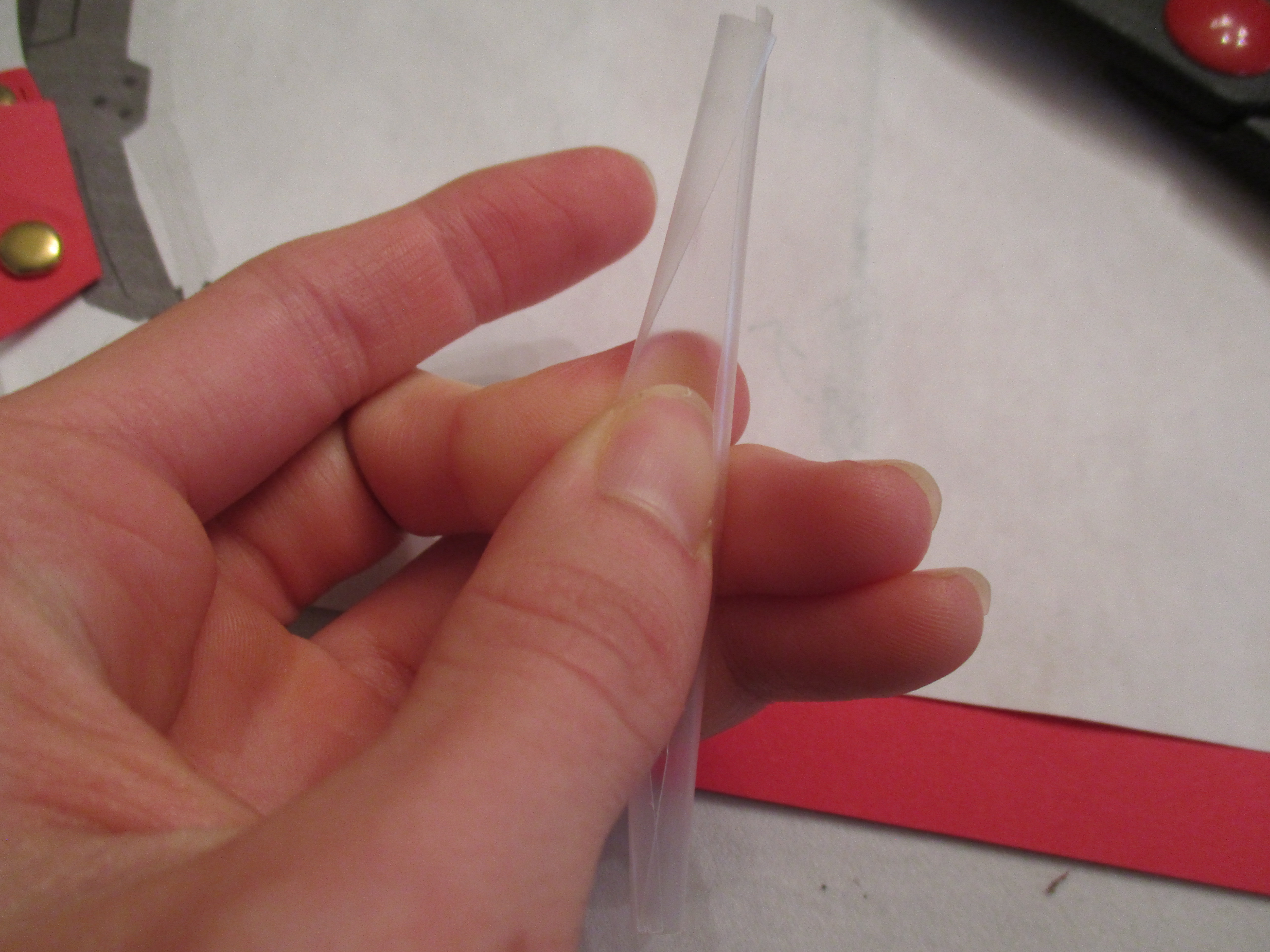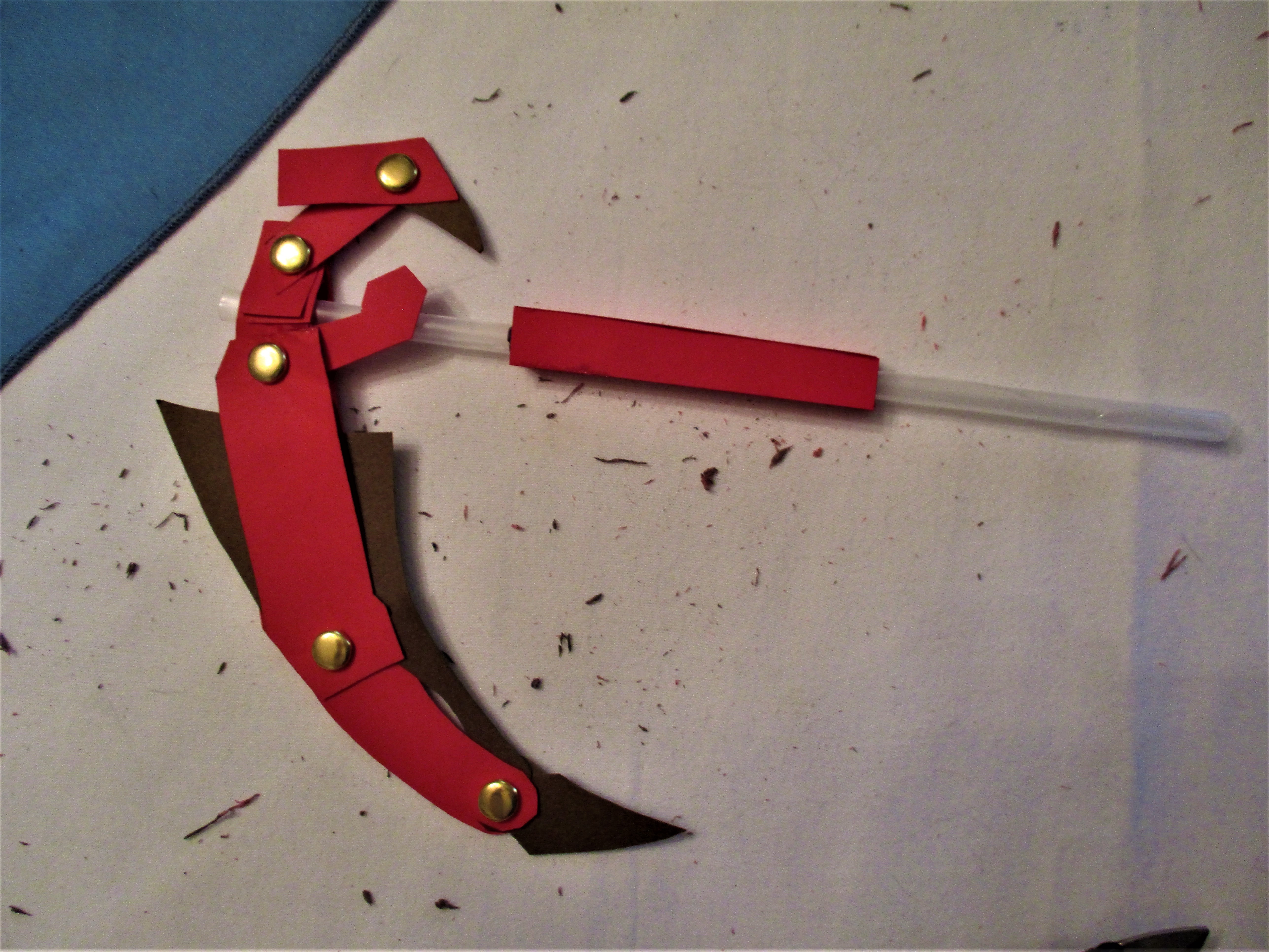 The scythe won’t close properly without a piece to join the front and back sections of the scythe. This is where the "crossbar" comes in. This piece can be tricky to make because the cardstock will be folded across the straw in two places.