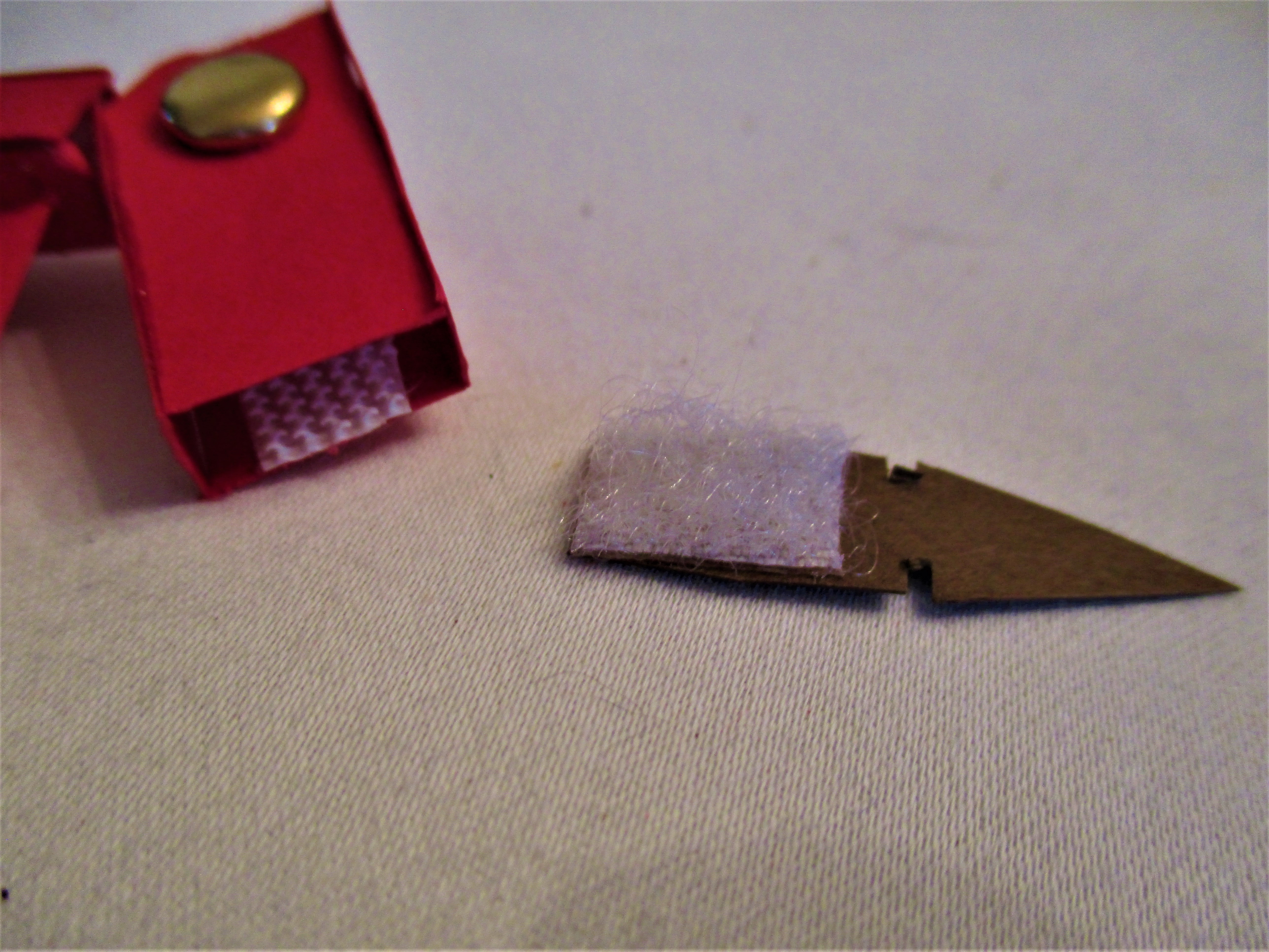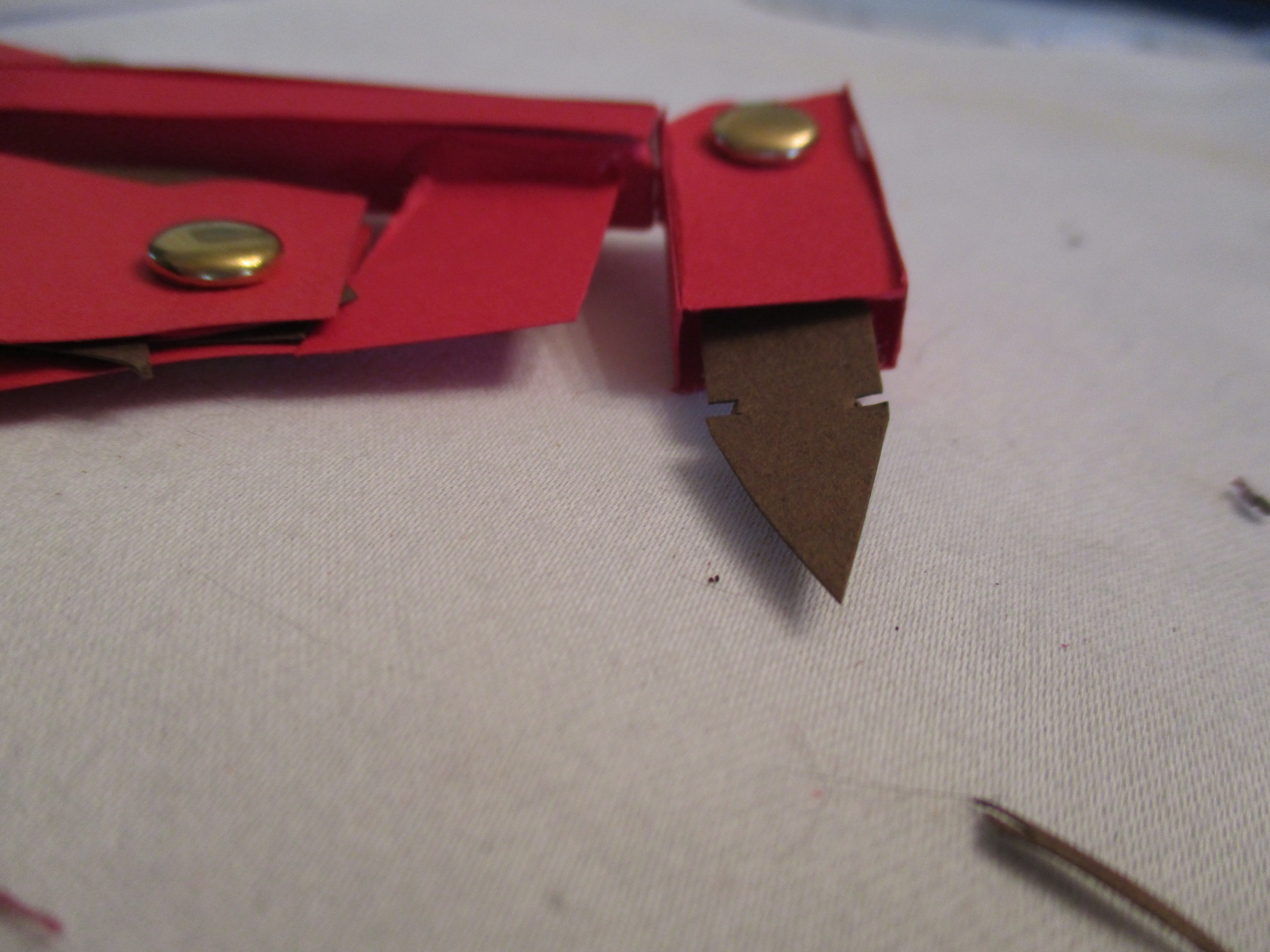Making the rifle stock was quite similar to the rifle box, only a fastener was inserted through the 3rd straw. The butt spike was a little trickier. I wanted it to vanish when in its collapsed form, but the stock wasn’t big enough to accommodate the spike. So I added a tiny bit of Velcro on the inside of the stock and the spike itself. I also added a bit behind the main blade base to attach the spike when folded.