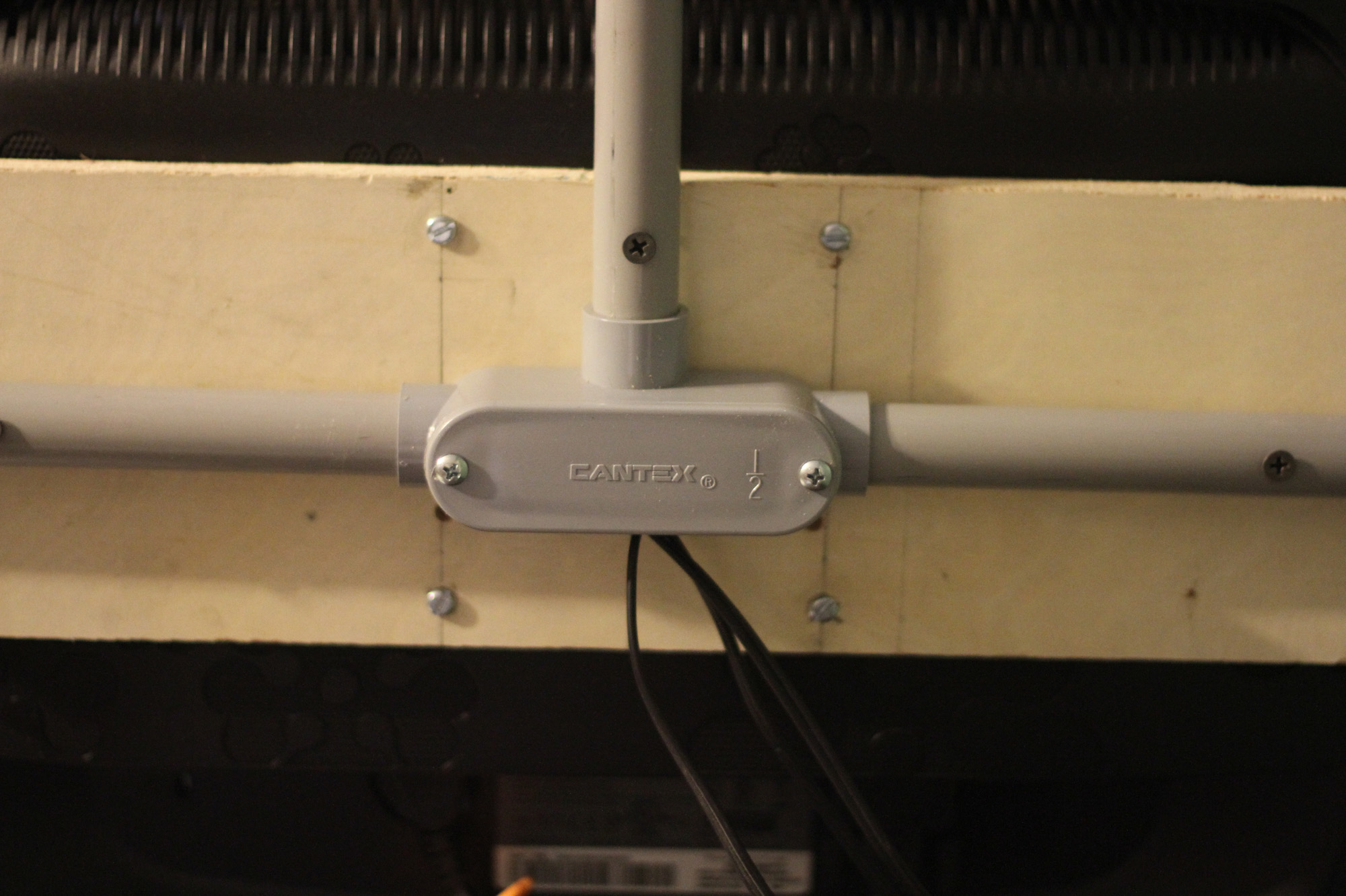 Drill a hole in the bottom of the T fitting and you'll be able to pass all of the speaker wires through the bottom and hide them behind the base of your monitor.
