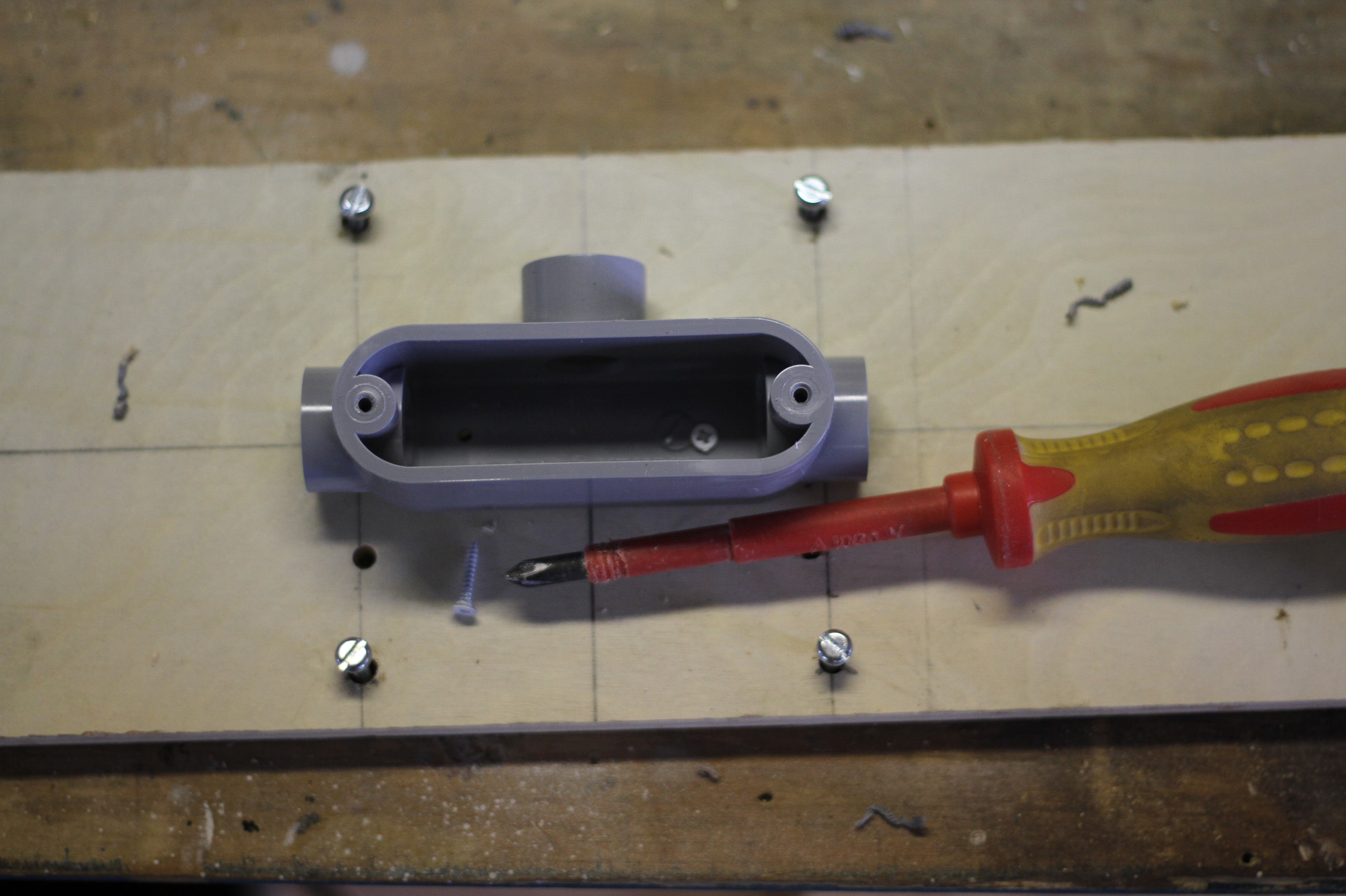 To mount the T fitting to the board, drill holes through the back of the fitting and screw it to the board.