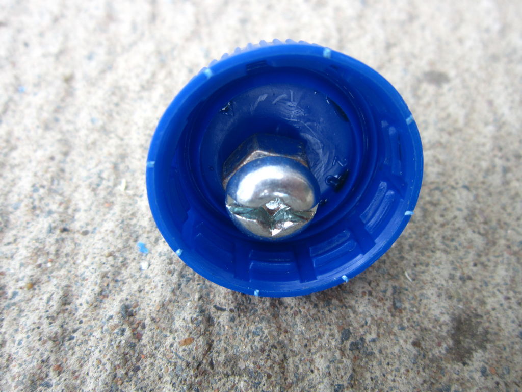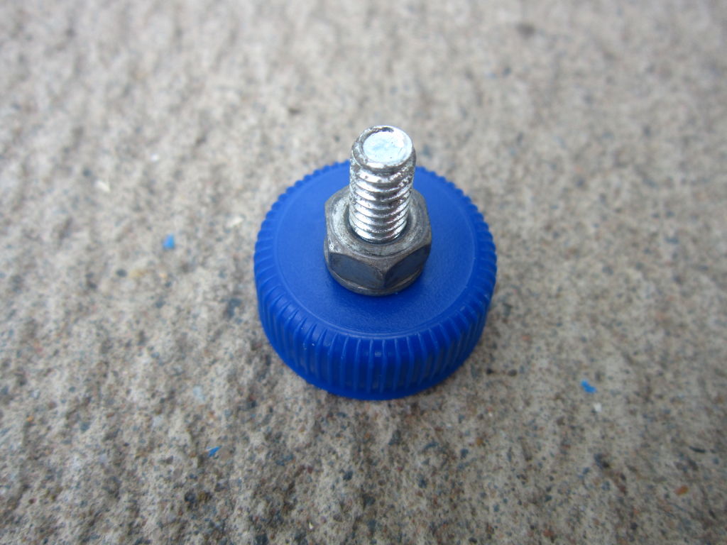 Ahora, enrosca una tuerca en el perno hasta la cabeza, y empújalo por el agujero desde abajo. Pon la arandela en el perno y luego la otra tuerca y aprieta todo con las pinzas y el desatornillador. Ya está. Sin embargo, si quieres pintarlo, vete al próximo paso.