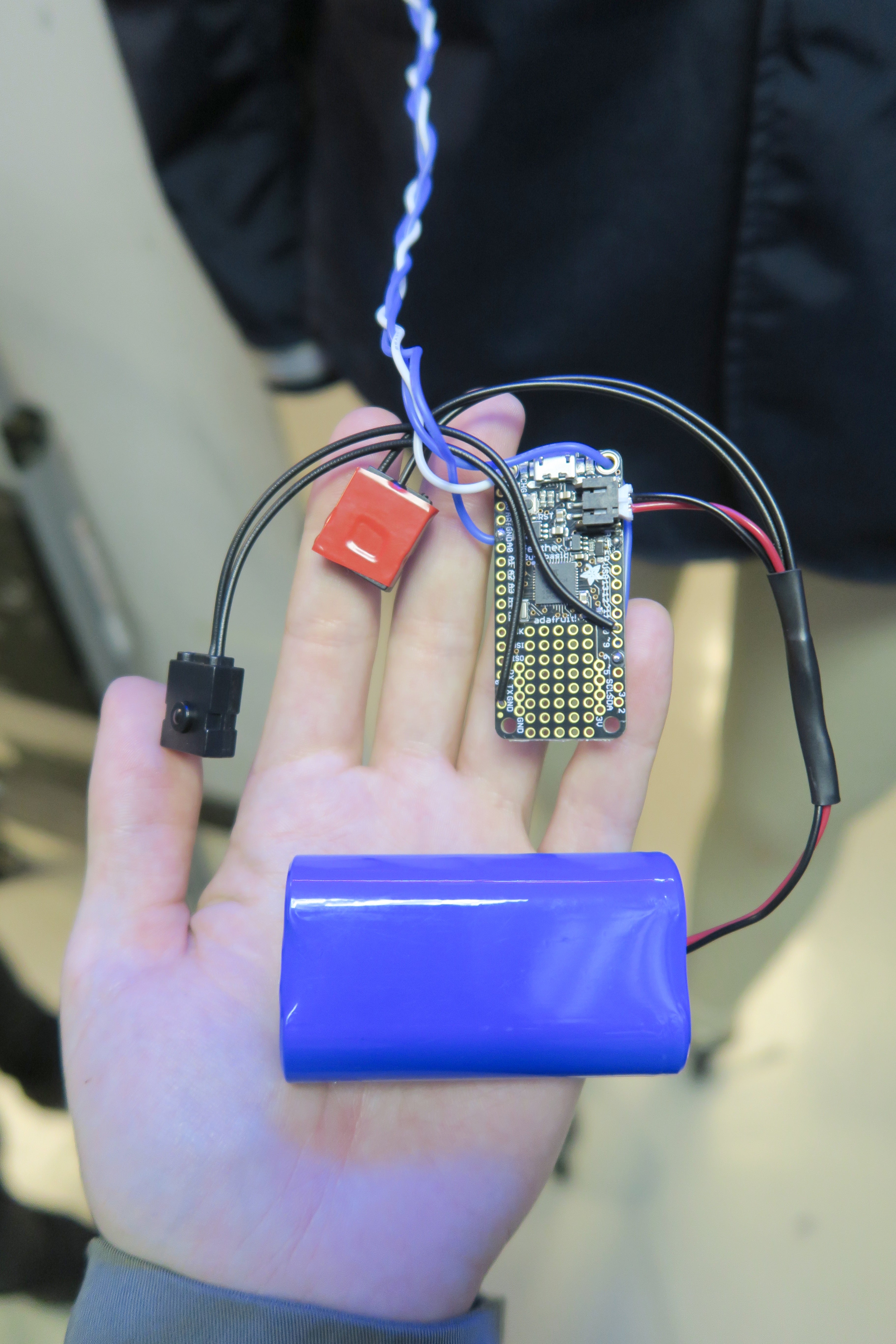 One switch controls battery power, and one triggers an animation effect to occur across the NeoPixels. The circuit is controlled by the Feather 32u4 microcontroller board, which sits in the front right pocket with the switches and battery.
