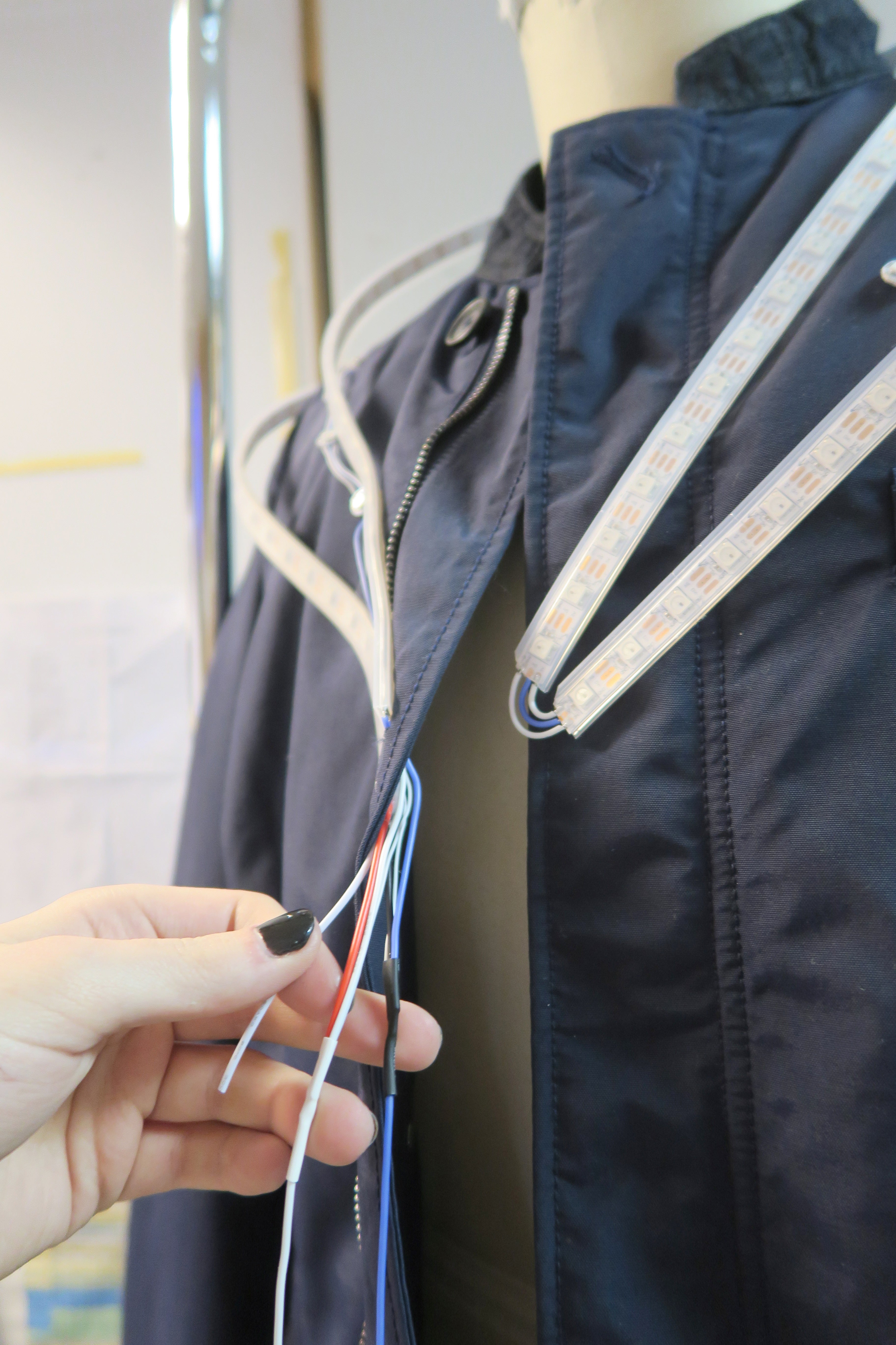 The design for the LED circuit was conceived by Antonia in The Late Show wardrobe department, sketched directly on the jacket with LED strip. To create your own design, put your jacket on a body form or patient model and pin your pixel strip in place (if pinning on a human, be careful not to poke your model). Leave more than you will need in each strip because it's easier to cut pixels off than it is to add them to a strip later.