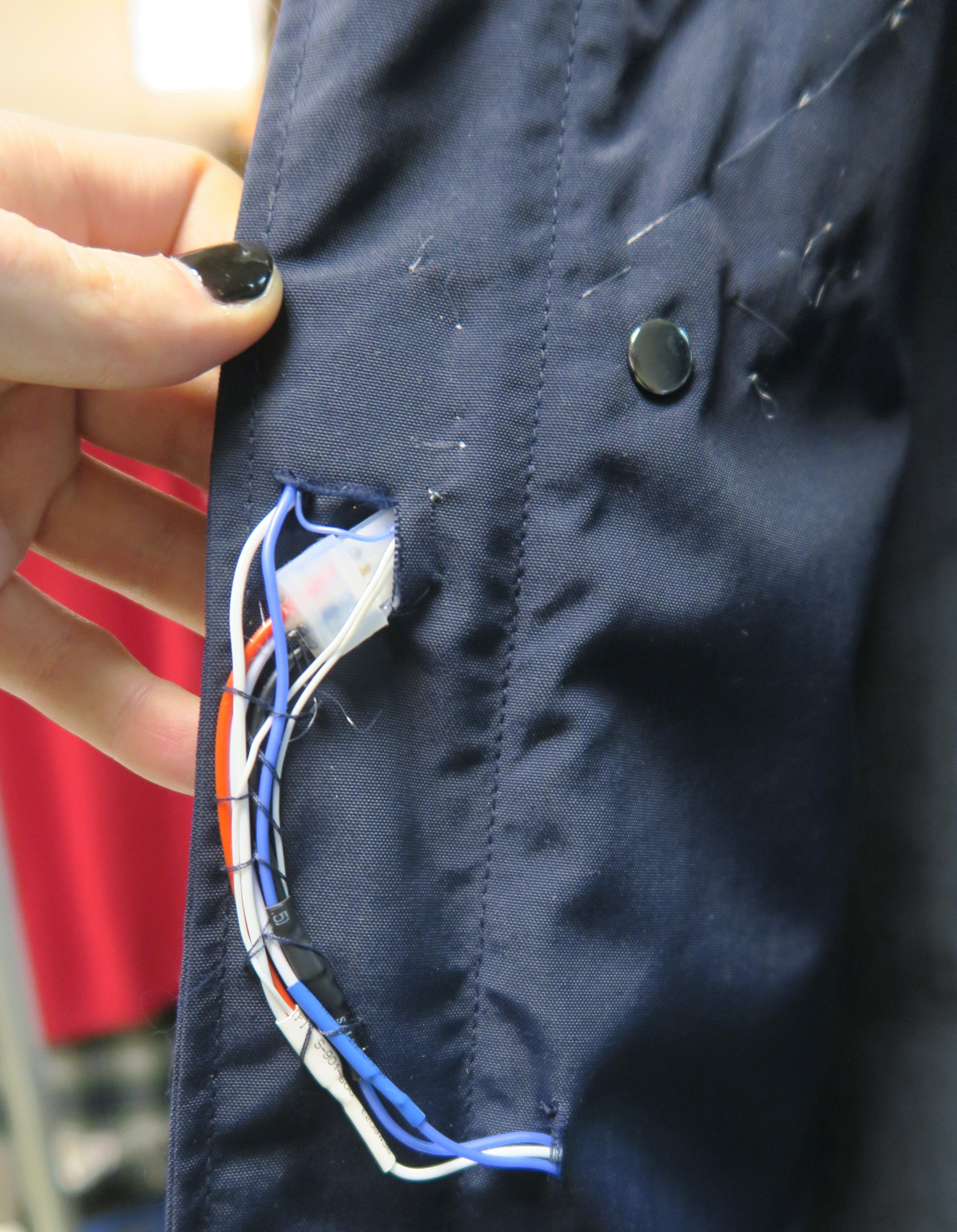Use a seam ripper to create routing holes for wires as you install different elements. Construction can get a bit awkward when you're taking the bunched up jacket to the soldering station, so be extra careful not to burn or melt anything unintentionally.