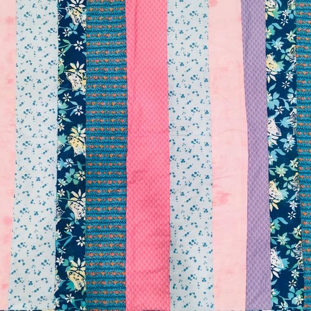 As we begin, you'll want to cut, arrange, and potentially purchase your fabrics. Your picnic blanket can be any size you want; it really just depends on how much fabric you use. My blanket fits one person comfortably but could allow for two. At this point, you'll need to decide whether you will use squares or long strips to construct your blanket. For any new sewists or crafters on a time-crunch, I would recommend strips. The pattern of the fabric doesn't matter, but you could make it match more effectively by repeating the same fabrics in a random pattern with some flashes of color here and there. If your fabric pieces are different lengths, you can trim them. It's a wise idea to have the order of your patterns worked out before you begin to sew.