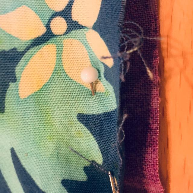 Now that you are ready, you can begin to sew your strips together! Don't forget to use pins (they really are a sewist's best friend). Lay the good sides (pattered sides) together with the edges aligned on one side (your strips may be different thicknesses), pin, and sew with whatever margin you like. Remember to backstitch to keep your thread firmly in your fabric. Your backstitch button or lever should have a curved arrow on it, as seen in the photo.