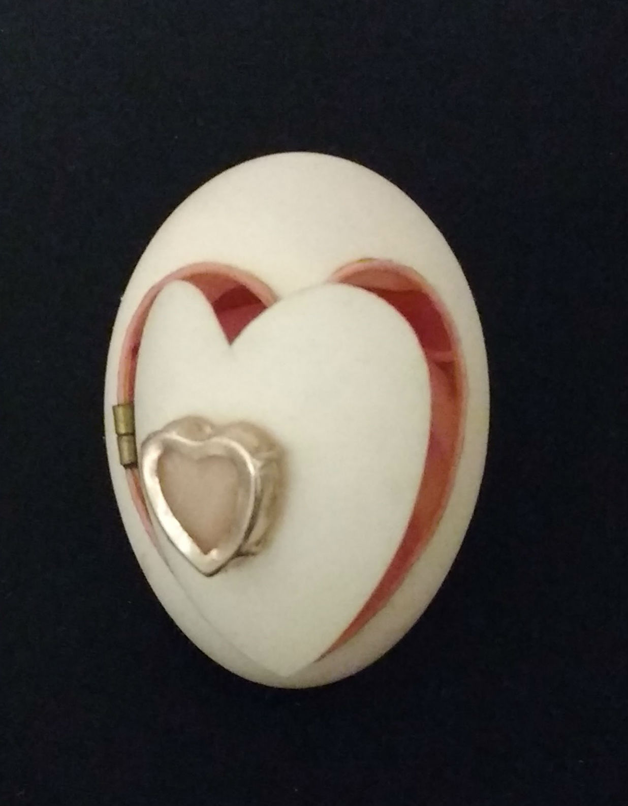 The egg shown here was a casualty of curious little hands that sadly, were able to reach the egg while being carried by a parent! :( In this case, the metallic cord was purely decorative and the heart window was attached with a jewel box hinge that had been cut in half.