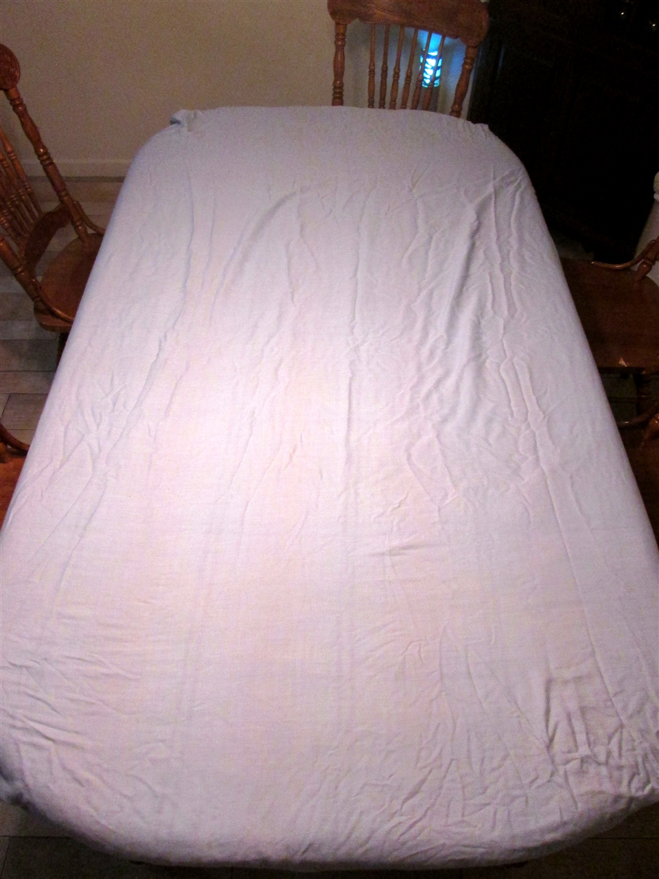 The second time I made an ironing board on the table top (yes there was a second through forth time) I used a very thick fleece blanket, the thick blanket and the sheet (for about a thickness of at least 1/2-inch above the wood top. The extra fleece blanket did not stick to the table top like the single blanket did, which was a good sign, and as the top was already ruined, I continued using the two-blanket plus one sheet system until the tablecloth was done.