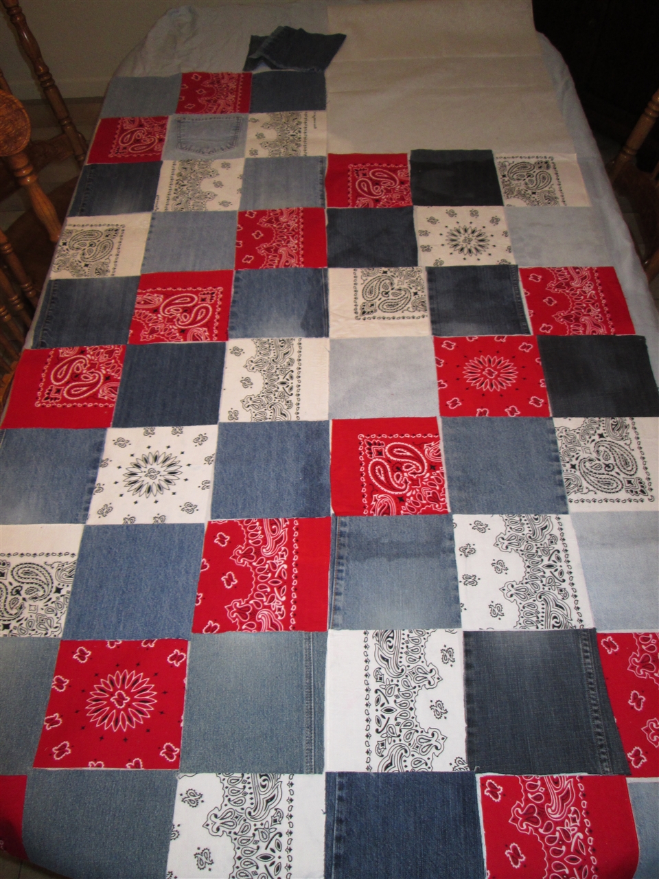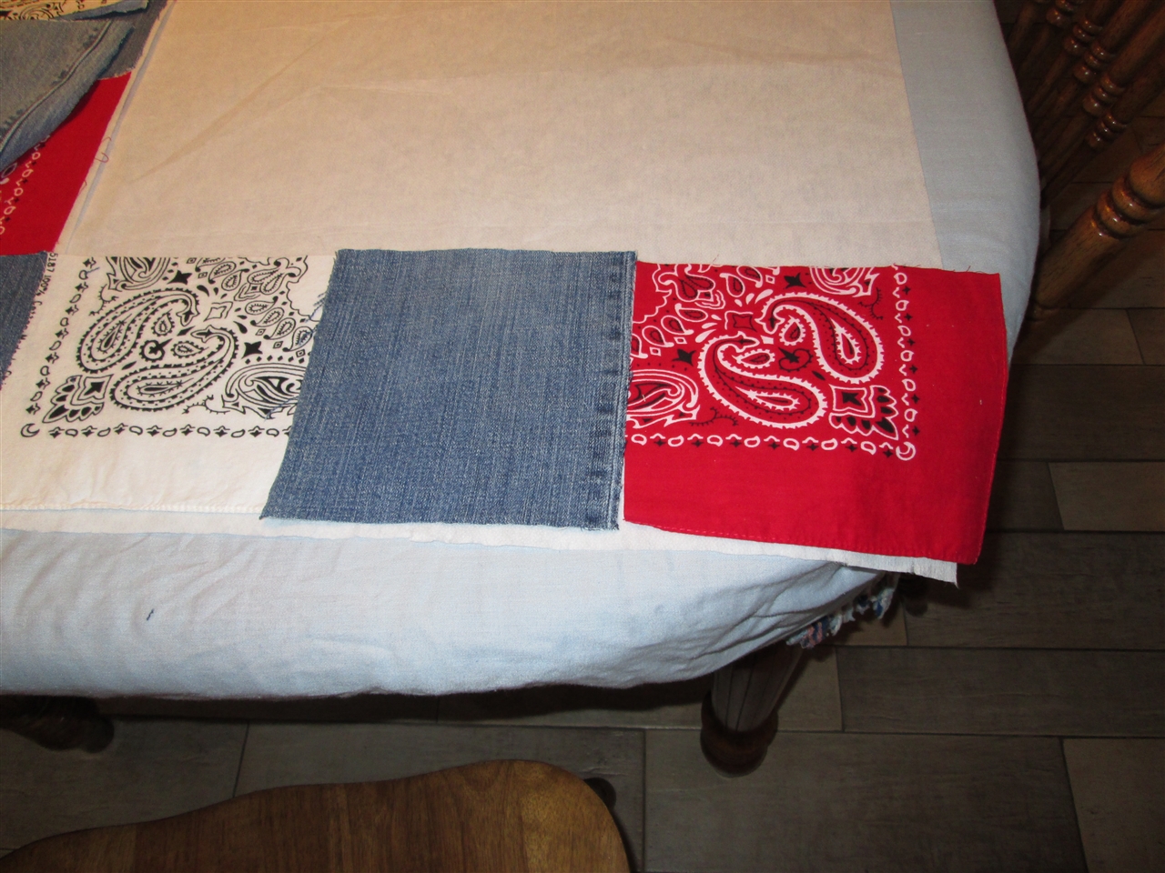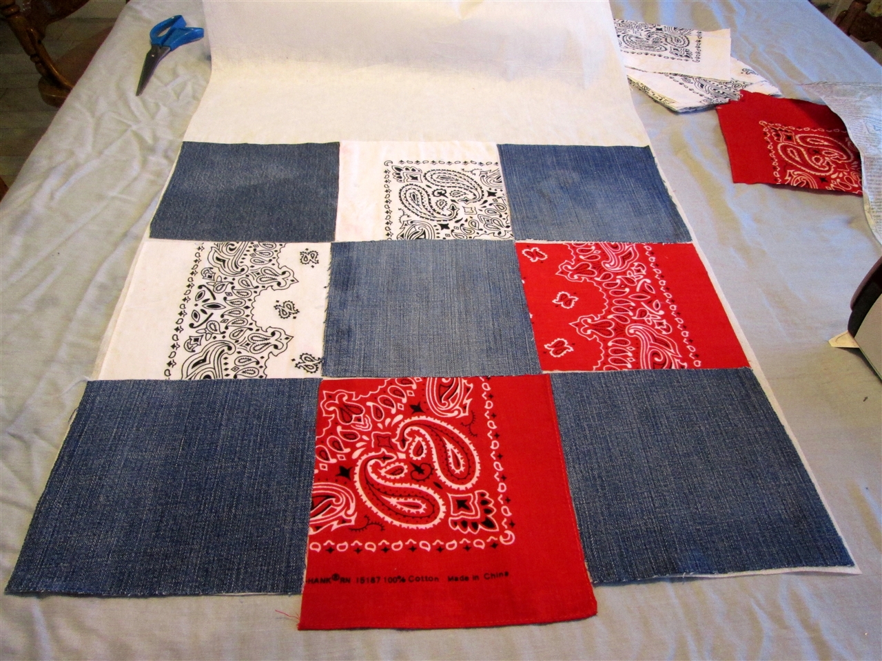 Each row was a string of jean-square, bandana, etc. and I took the time to pre-lay-out every row and ensured that it worked with every column.