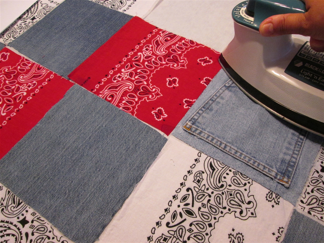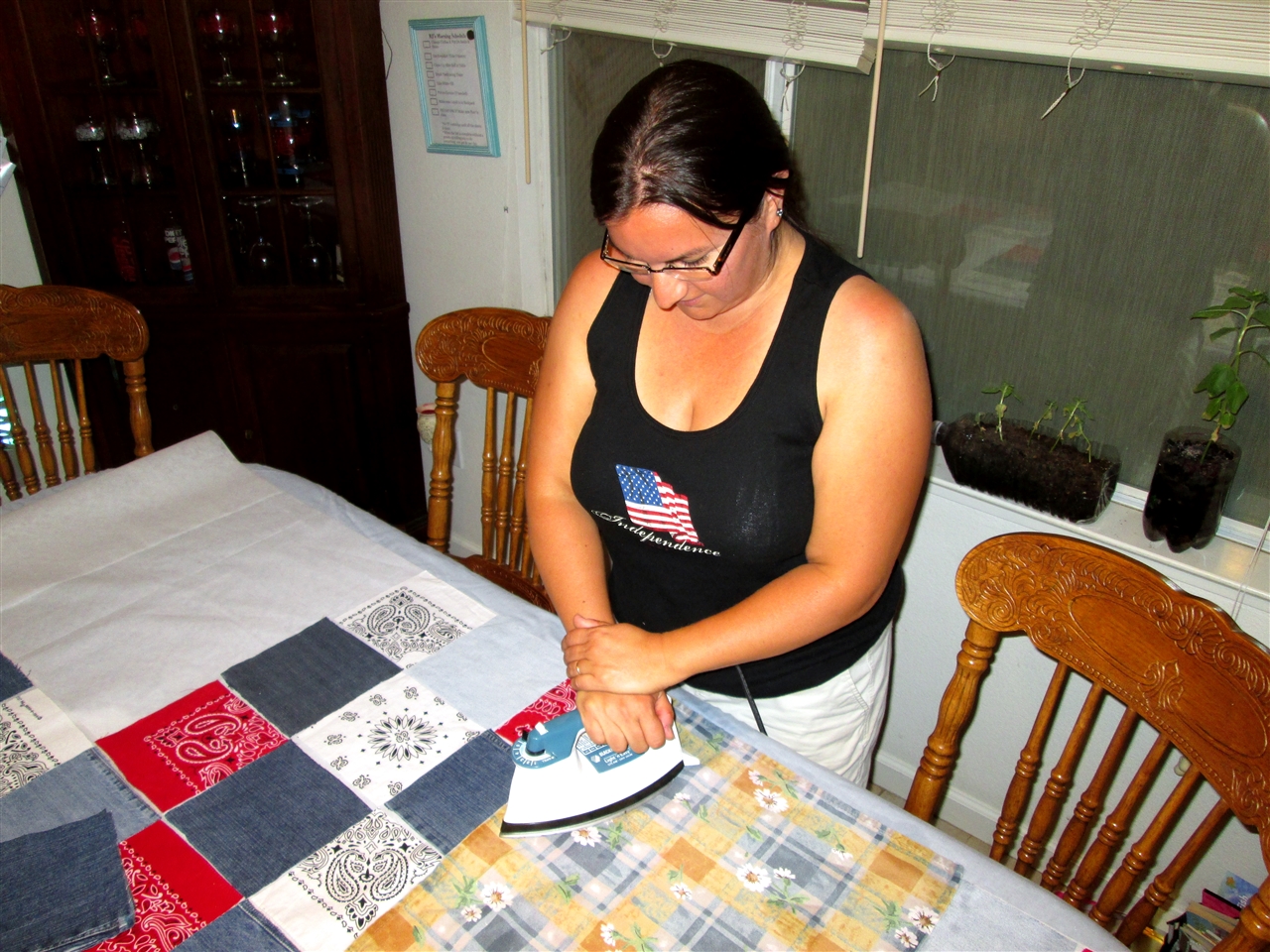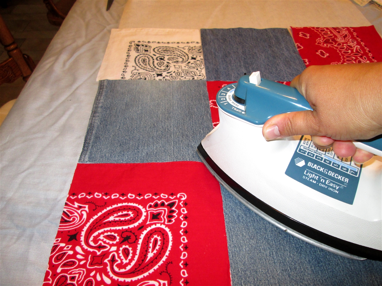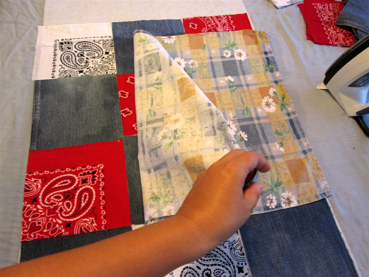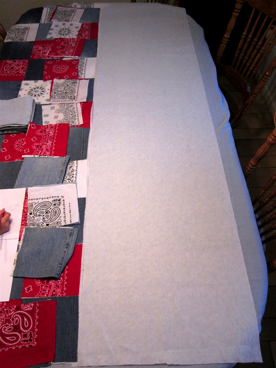 If I were to do it over again, I would be more aware of the placement of the jean material. As I cut the jean material in groups, I left the same colored jean pieces together in groups. That was an unintentional effect that I didn't pay attention to as I ironed the first side of the tablecloth together.