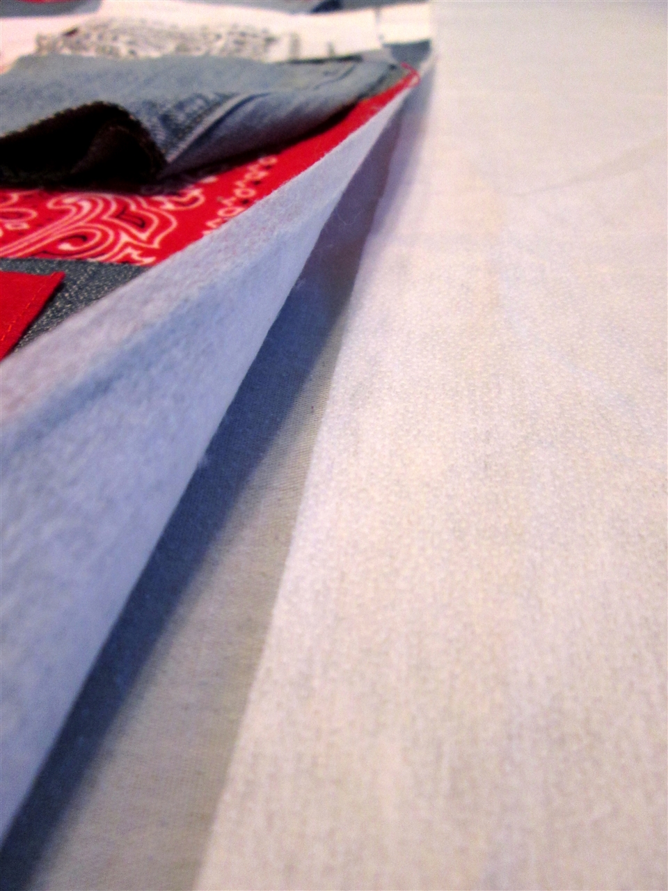 Overall, not including the cost of the recycled jeans, I estimate the cost to be close to $40 for all the bandanas, the fusible webbing, the bonding web packages, the bias tape and the hem tape. I know cost could have been saved if I used grosgrain ribbon for the inner trim, but that choice was long gone by the time I started the project.