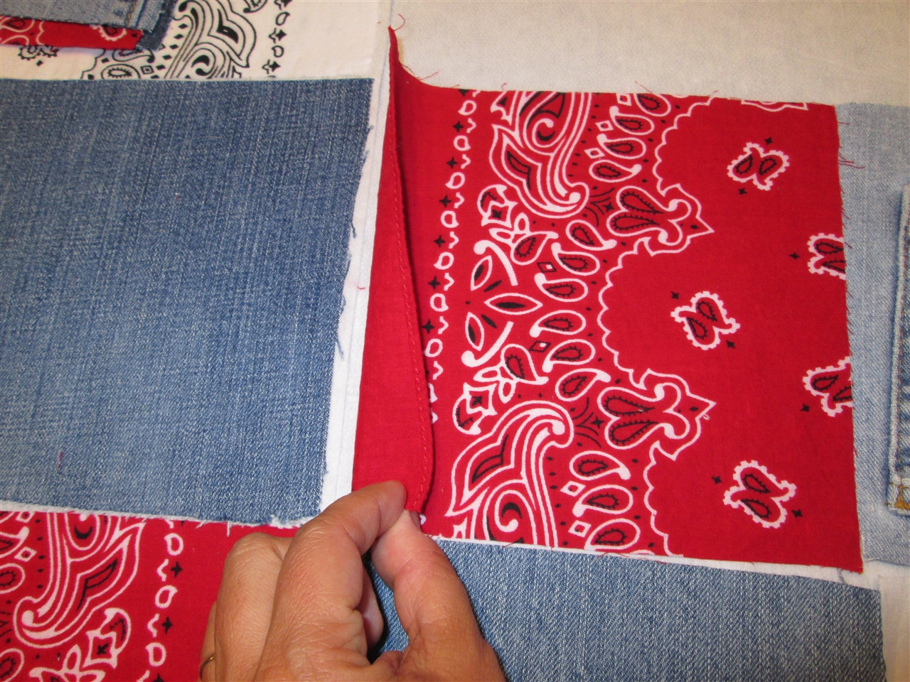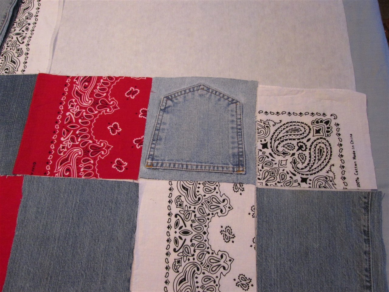 This side took me over two hours to complete, as I was short a few jean squares and ended up having to cut more.