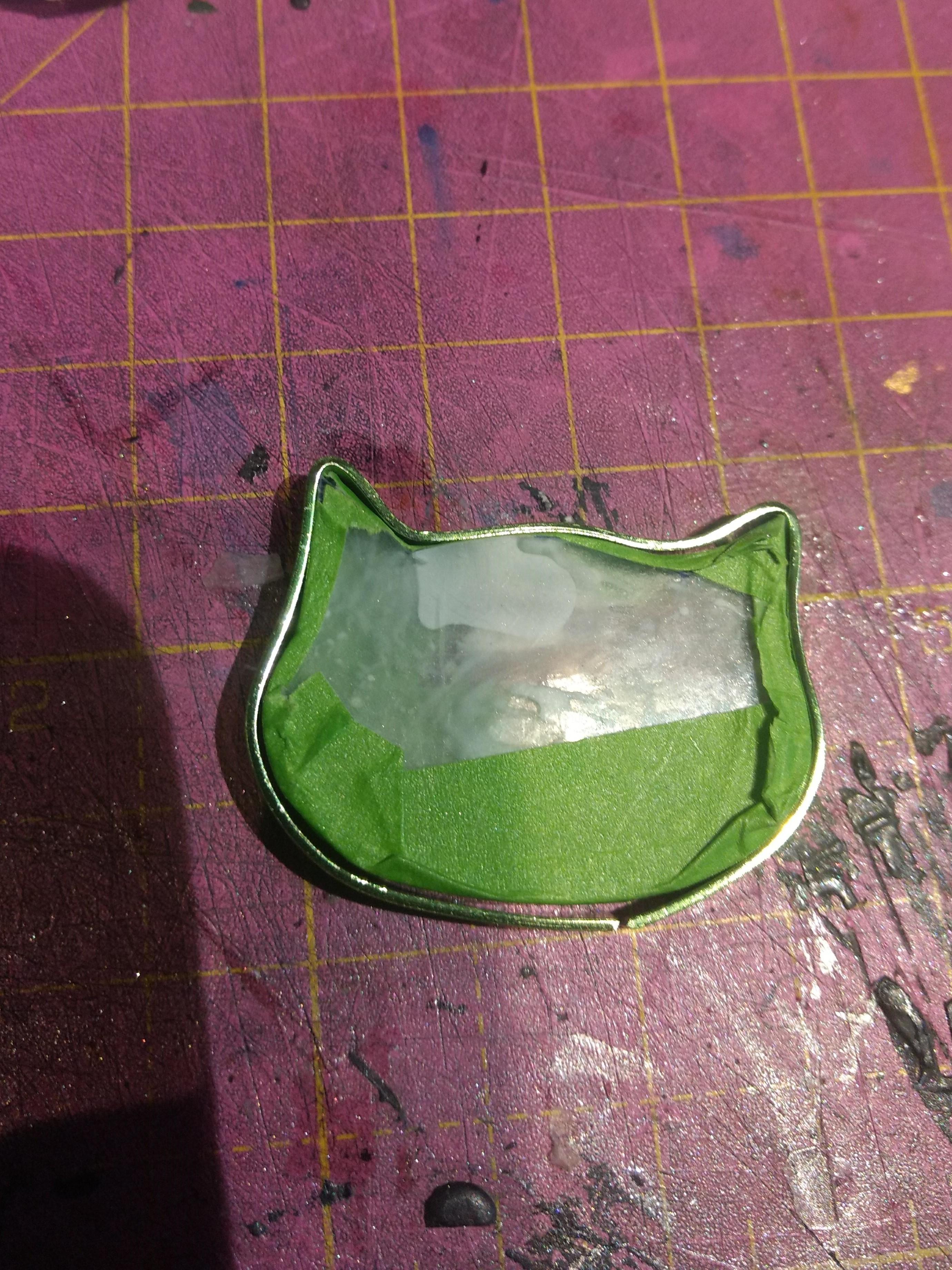 Once your resin is almost or completely cured, it's time to add the whiskers and final domed layer. First remove your small extra piece of tape from each bezel, so it doesn't interfere with the dome effect. Then snip some lengths of the fine gauge wire - I did six per cat - and bend them a little, putting them in place on your cat bezels.