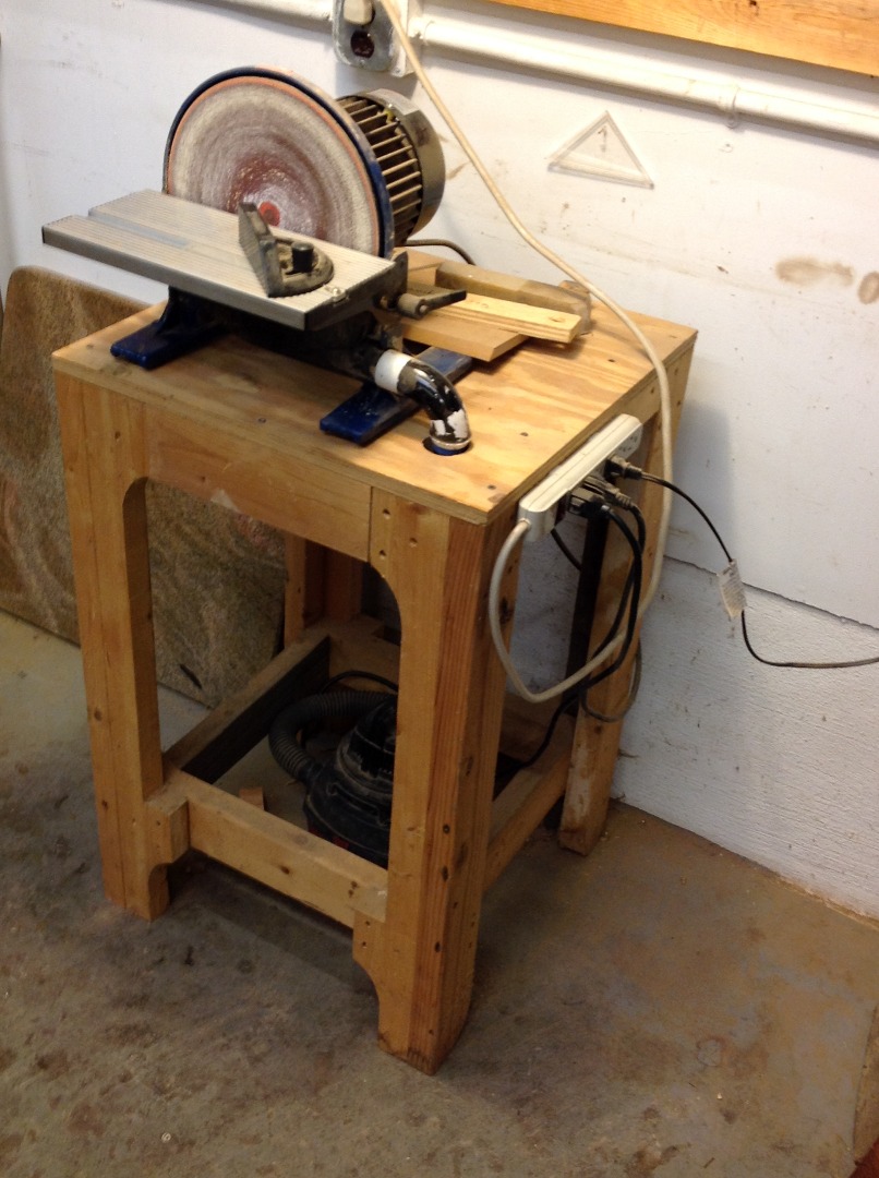 This is my disc sander I have attached a small shop vac to, and added a light overhead to help illuminate my work piece. Switching all three of these things on and off whenever I need to use them is a hassle, I usually have my hands full and I need all three on and then off at the same time. I put them all on one power strip and turned them all on. Now I only have one switch to control them all, I find it much more user friendly.