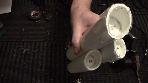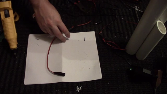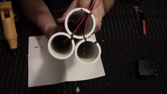 Thread your speaker wire through the smaller pipes and into the big pipe and out through the back hole. Cut them all the similar length depending on your need. These will connect to a pigtail and eventually the power supply. Strip off the insulation for connection to the pigtail.