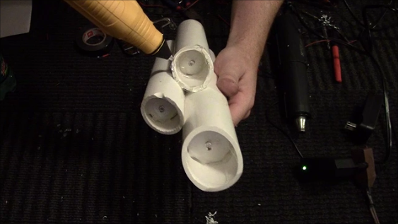 Fit the pieces together so that you get a 3-tiered effect or however you want to arrange them. Turn them so the flat ends are facing you and mark where the smaller pipes connect to the bigger pipe and then make one mark where you want the wires to exit the big pipe. Drill holes using the 5/16" drill bit (you can use smaller like 3/16" but it might be easier to use a bigger drill bit so you won't have to be as accurate on your hole locations), and then drill a hole on the big pipe for the wire exit. Try to get the holes to line up, you can measure from the pipe edge or just eye-ball it.