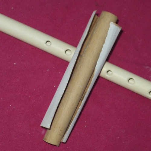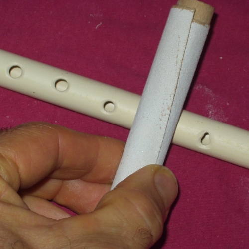 I made a special tool to get inside the drilled finger holes and scrape the burrs from inside of the tootophone body. (A tiny knife with a bent end, made of stainless steel welding rod.) That, too, reduces turbulence and makes the instrument easier to play.