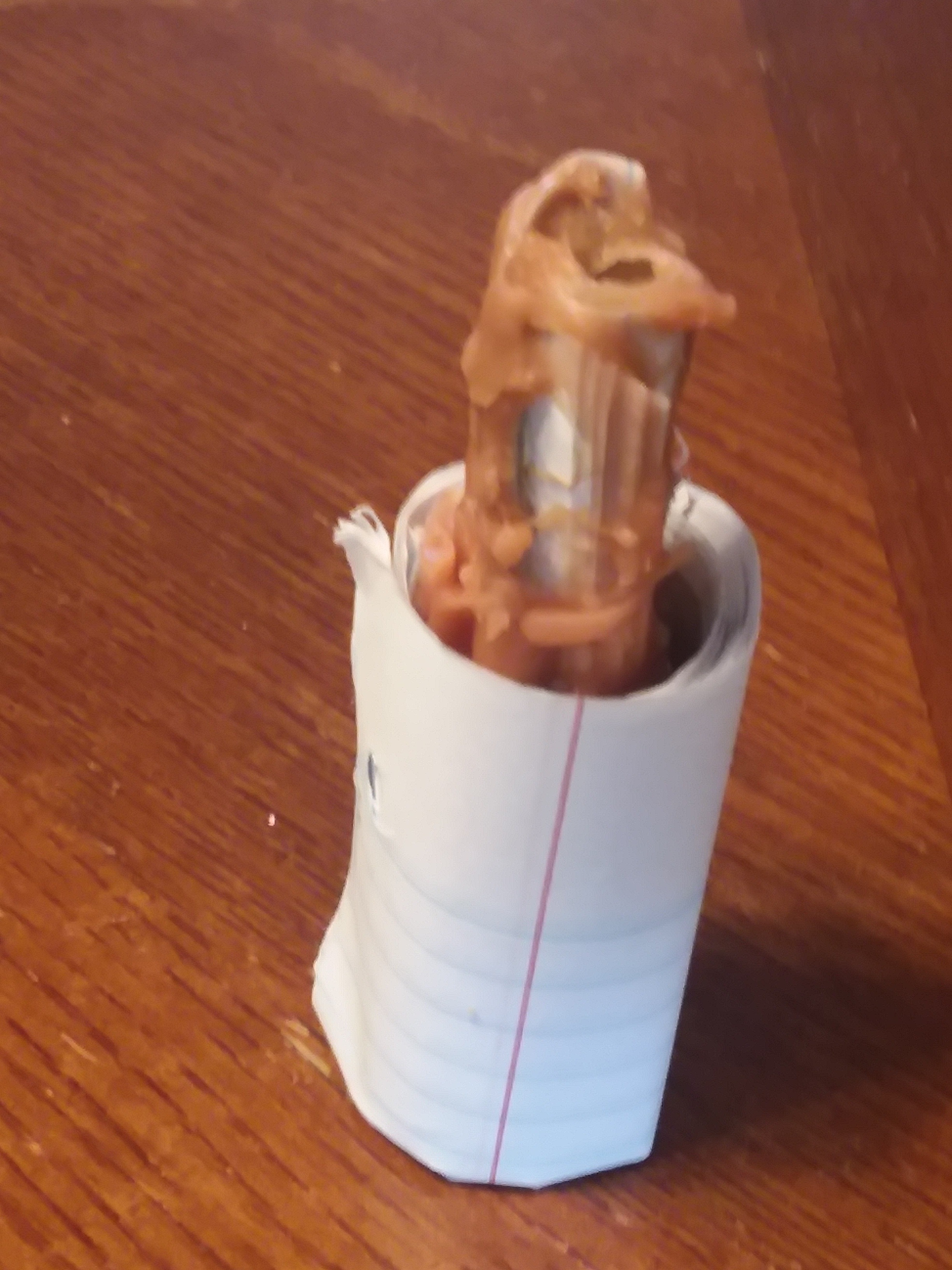 When the previous steps are done, and the wax is melted, pour the liquid wax onto the skinnier roll of paper and twine. I suggest using something like a lid to stop the wax from securing itself to your table. After the wax has cooled, put the roll into the bigger roll and pour more wax into it. After that, remove the tape, and either take it to the fire pit or throw it in your bag for camping!