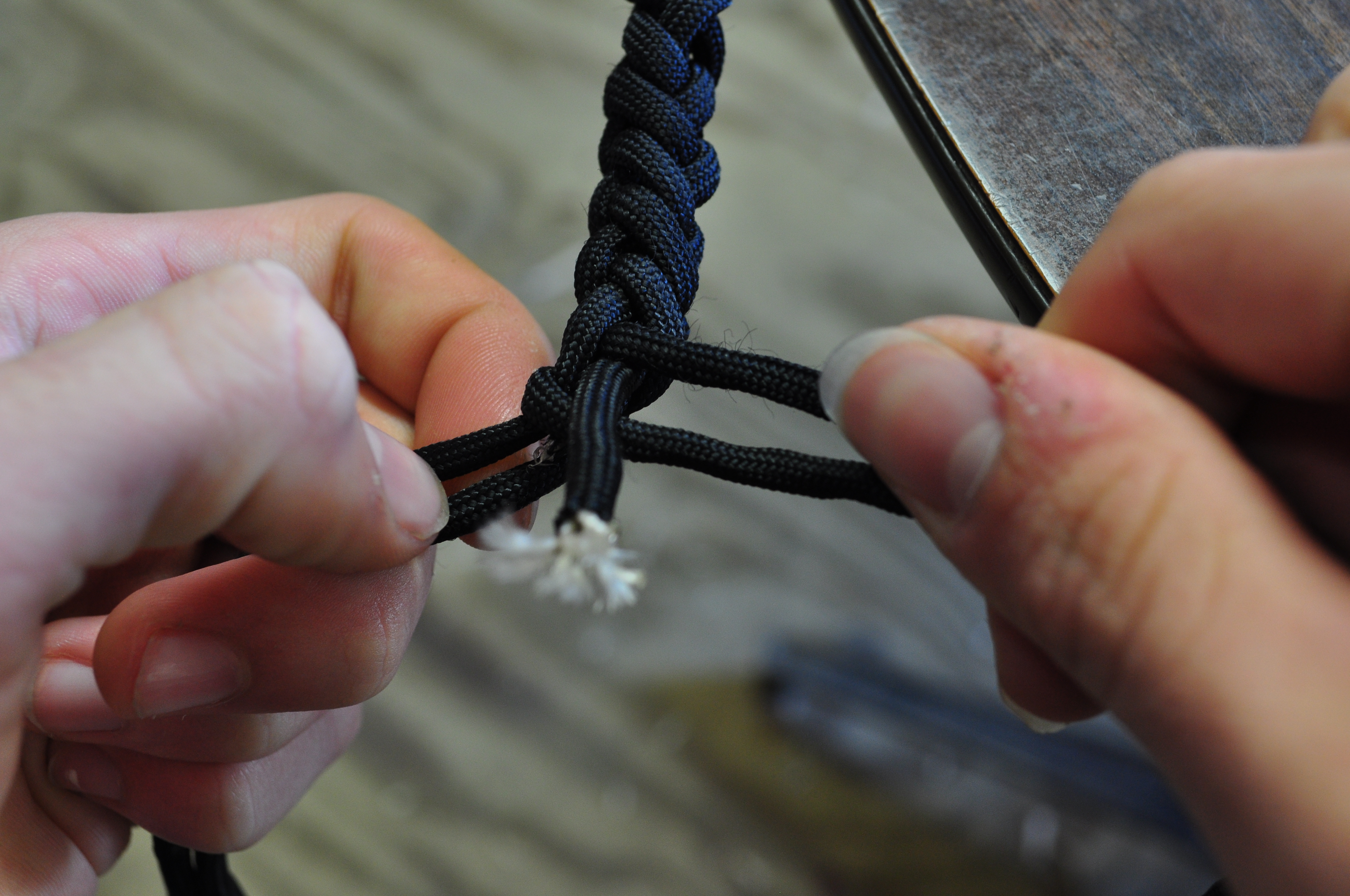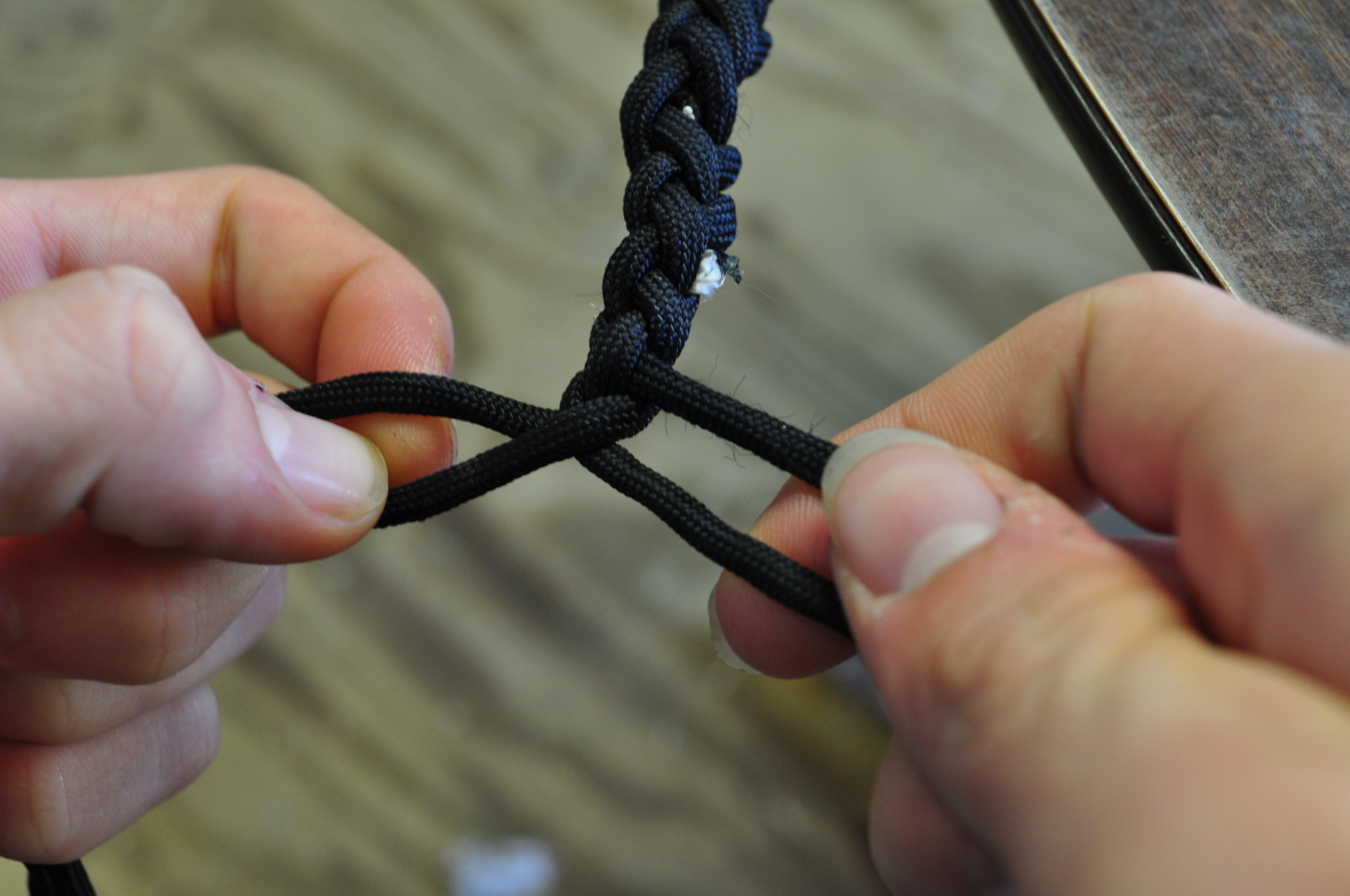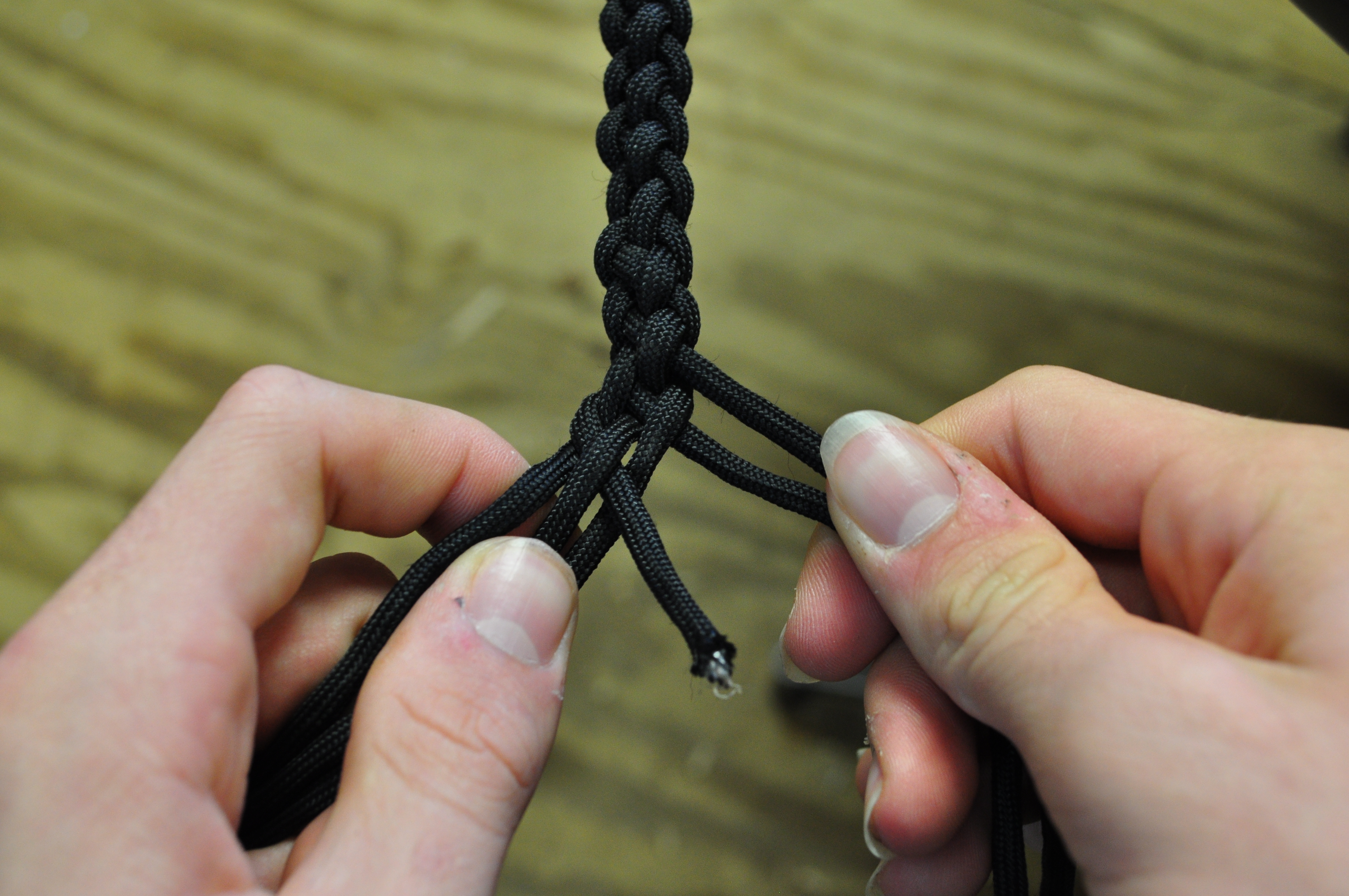 First, separate the strands and hold one strand from each hole in each hand (so three strands per hand). Once you're holding the strands as shown, take the top right strand around the back and over the top left strand, under the middle left strand, over the bottom left strand, and back over so that it is now in the bottom right position. Next, take the top left strand and pull it around the back over the top right, under the middle, over the bottom strand, and back over so that it is now the bottom left strand. You're going to want to repeat this process until one of your strands (it doesn't matter which) only has about 1-2 inches left. When you've reached this point, continue the braid until the short strand is in the bottom position. Then try to hold the short strand in the middle of the whip and continue to braid around it until it is completely surrounded. This is the method you will use whenever you drop a strand. If you're slightly confused by trying to braid with five strands instead of six, just imagine that the sixth strand is still there and continue to braid as such. Eventually, you'll drop another strand in the opposite hand so that now you'll be doing a four strand hollow round braid. This is done pretty much the same as a six strand braid. Just take whichever strand is on top, pull it around the back, over the top strand, under the bottom strand, and back over to the bottom of the side you started on. When it comes time to drop the fourth strand, go ahead and braid until it only has about 3/4 of an inch left. then completely forget about it and switch over to a typical three strand braid (the kind that's used in hair). When one of these strands only has about 2 inches left then cut the second longest strand to be the same length. Then take the longest strand and tie it around both of the short strands using a very tight half hitch as shown.