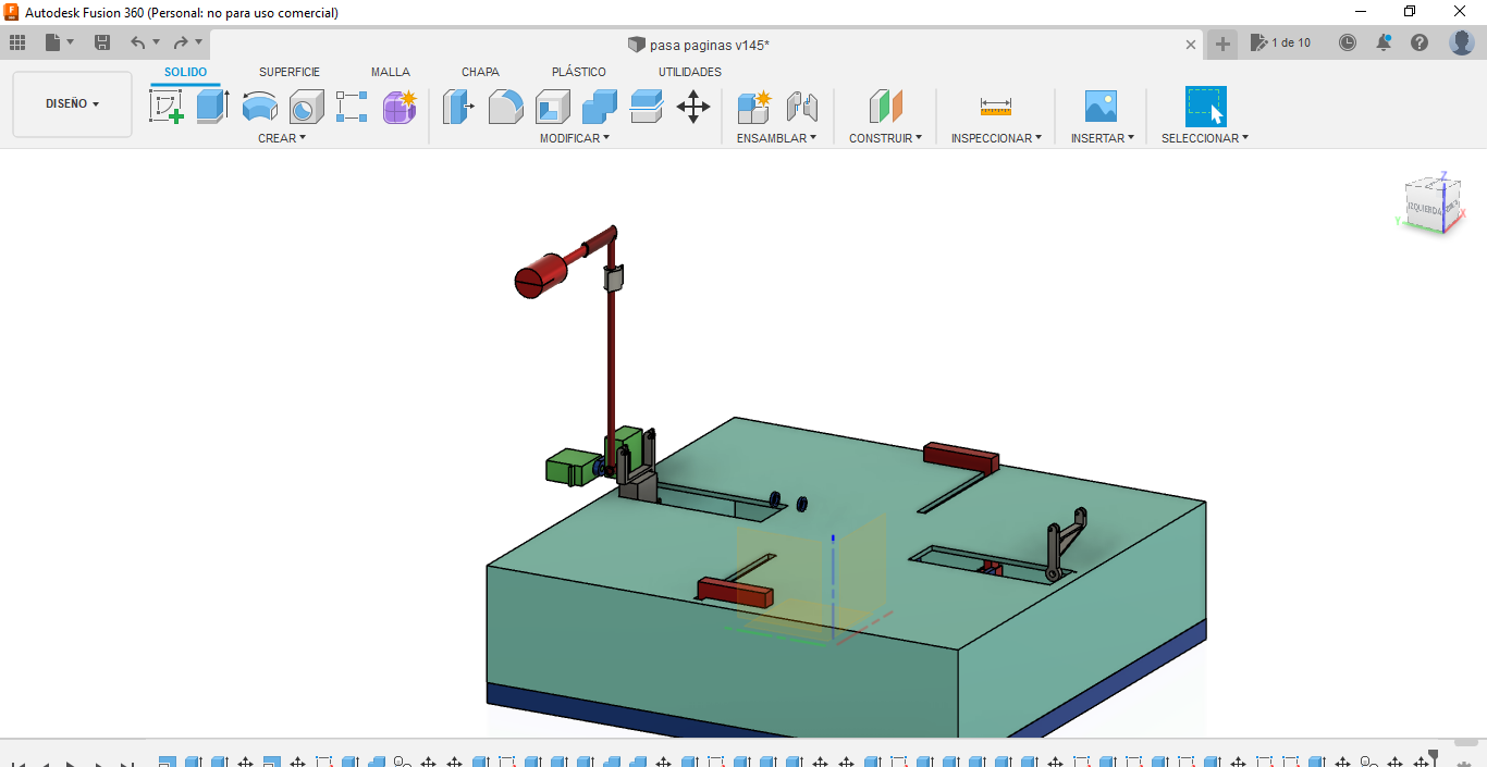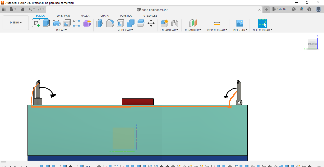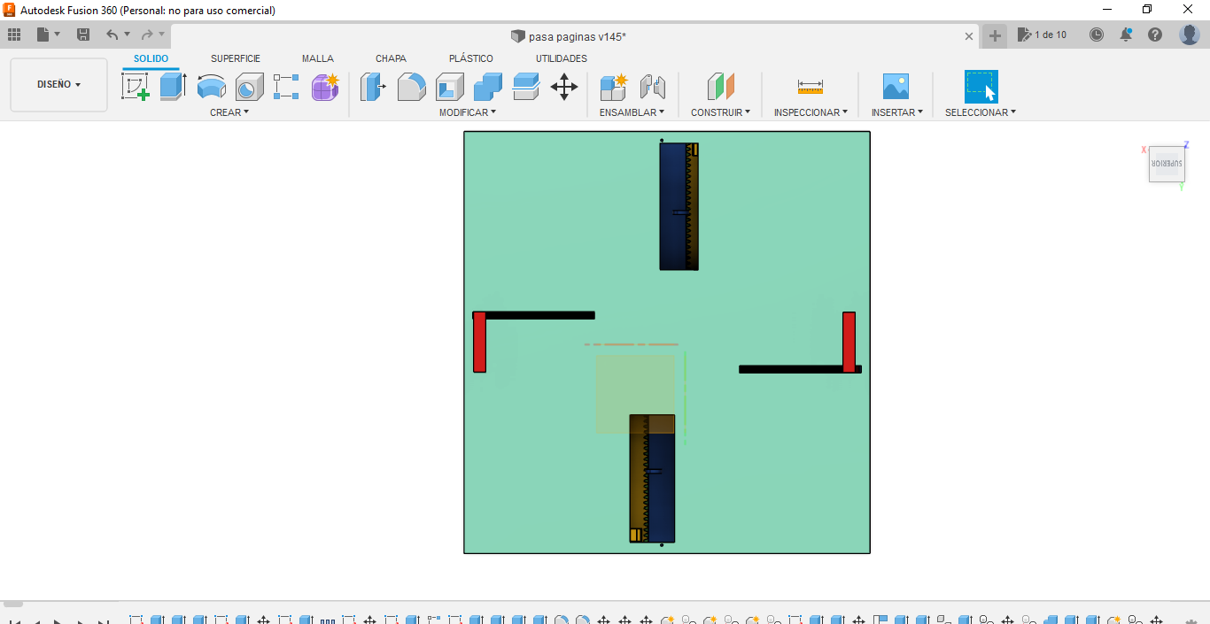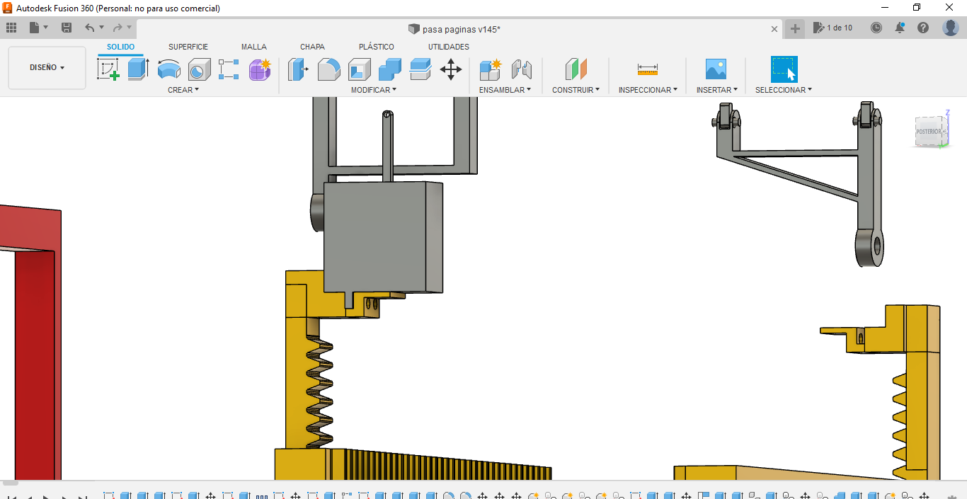 Encima de la cremallera amarilla va un amarre al servo con tornillo (tuve que diseñar el servo igual). Para que el libro se sostenga y no se vayan cambiando las páginas se necesita esos 4 apoyos.
