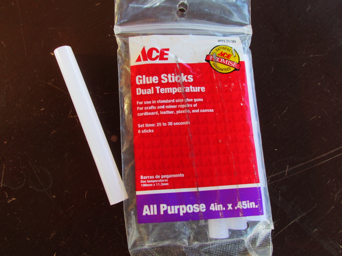 - Package of 6 All-Purpose hot glue sticks for standard size gun (4"x .45"), $1.99 USD (found mine in hardware store, but Hobby Lobby also carries them)