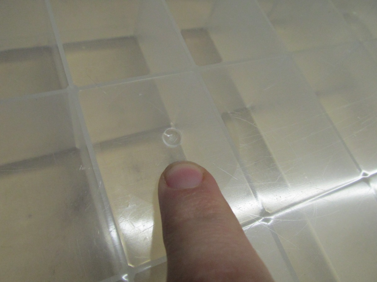 Now we will have to prepare the pieces of the display for gluing. On the bottom of each box, there are two little spots that could have excess plastic that sticks out, and prevent the boxes from laying flat when placed on a flat surface. Check them over with the pocketknife. Next, we must scratch up the surfaces to be glued using the blade of the pocketknife turned perpendicular to the box's surface. Do this so that the surface looks frosted and no longer feels slick. This will help the glue to stick. Put the boxes together in the orientation in which they will be glued to make sure you are scratching the correct part of each box!