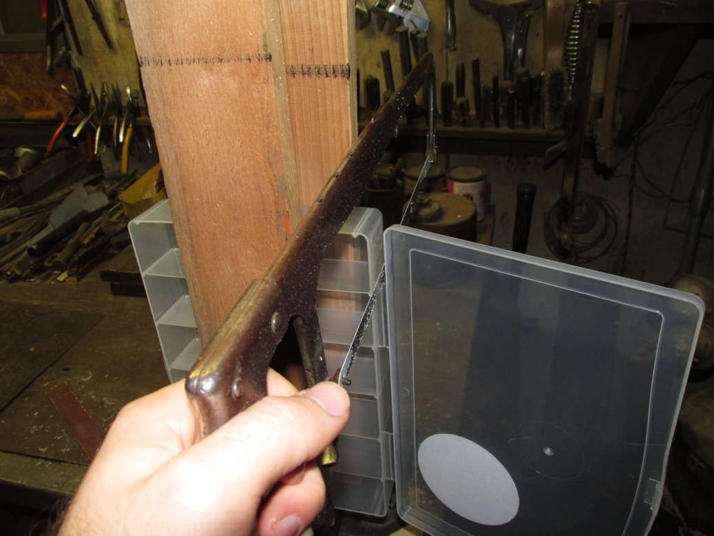 When cutting things with a hacksaw it is important to keep them from moving around, so I clamped my boxes in the vise between two boards. Then I simply cut through the hinges and removed the lids. You don't have to cut very close to the box itself, because in the next step you are going to use a pocketknife to shave off whatever remains of the hinges. The closer you cut to the box, the less hinge you have to shave off later. The drawback is that if you are not careful the hacksaw blade could scratch the box you are trying to keep.