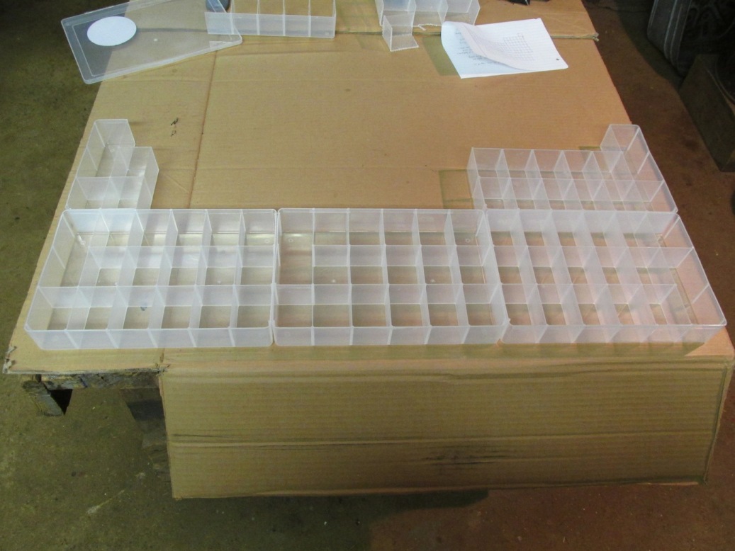 Okay, so lets arrange our boxes and get a look at what we have built so far. Use the picture as a guide. Each bead-storage box is six compartments wide, so we put three of them side by side to make the periodic table, which is 18 columns wide (the box with the intact hinge is the one between the two other intact boxes).