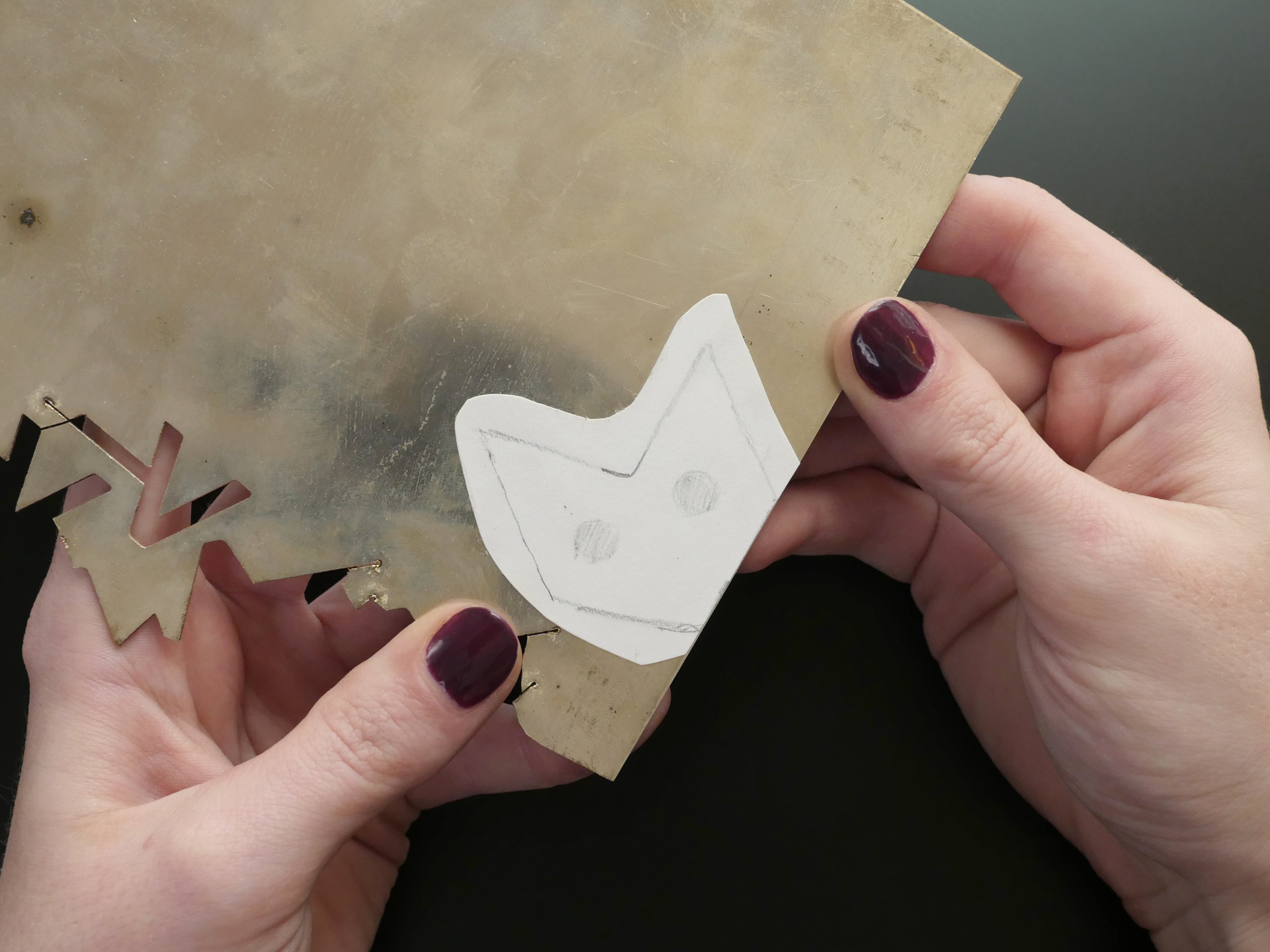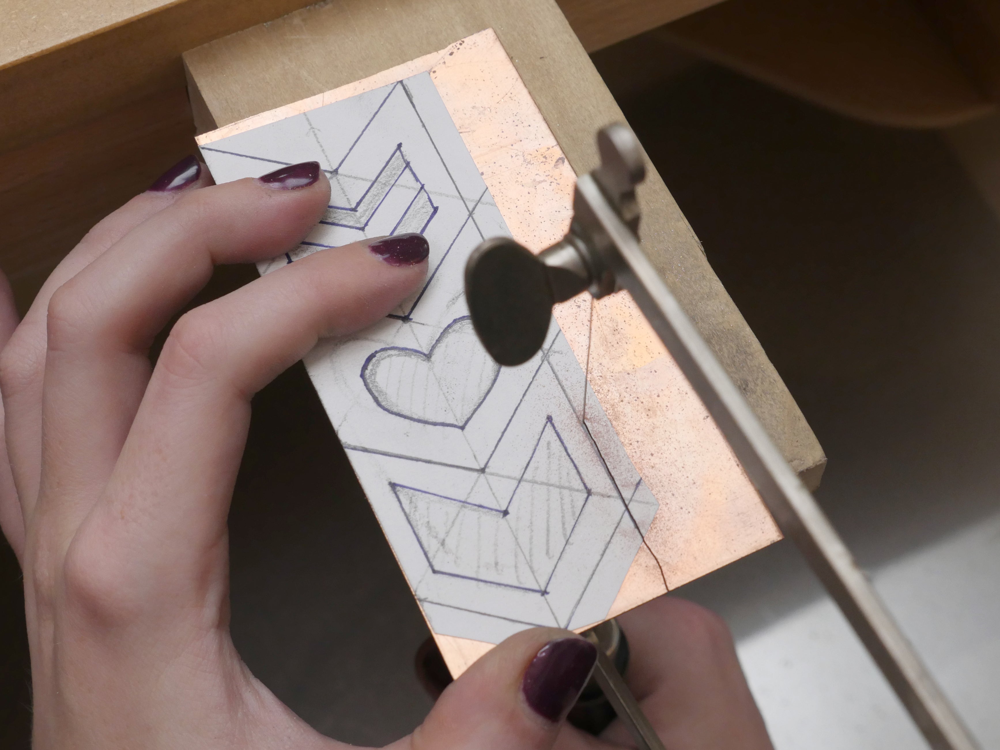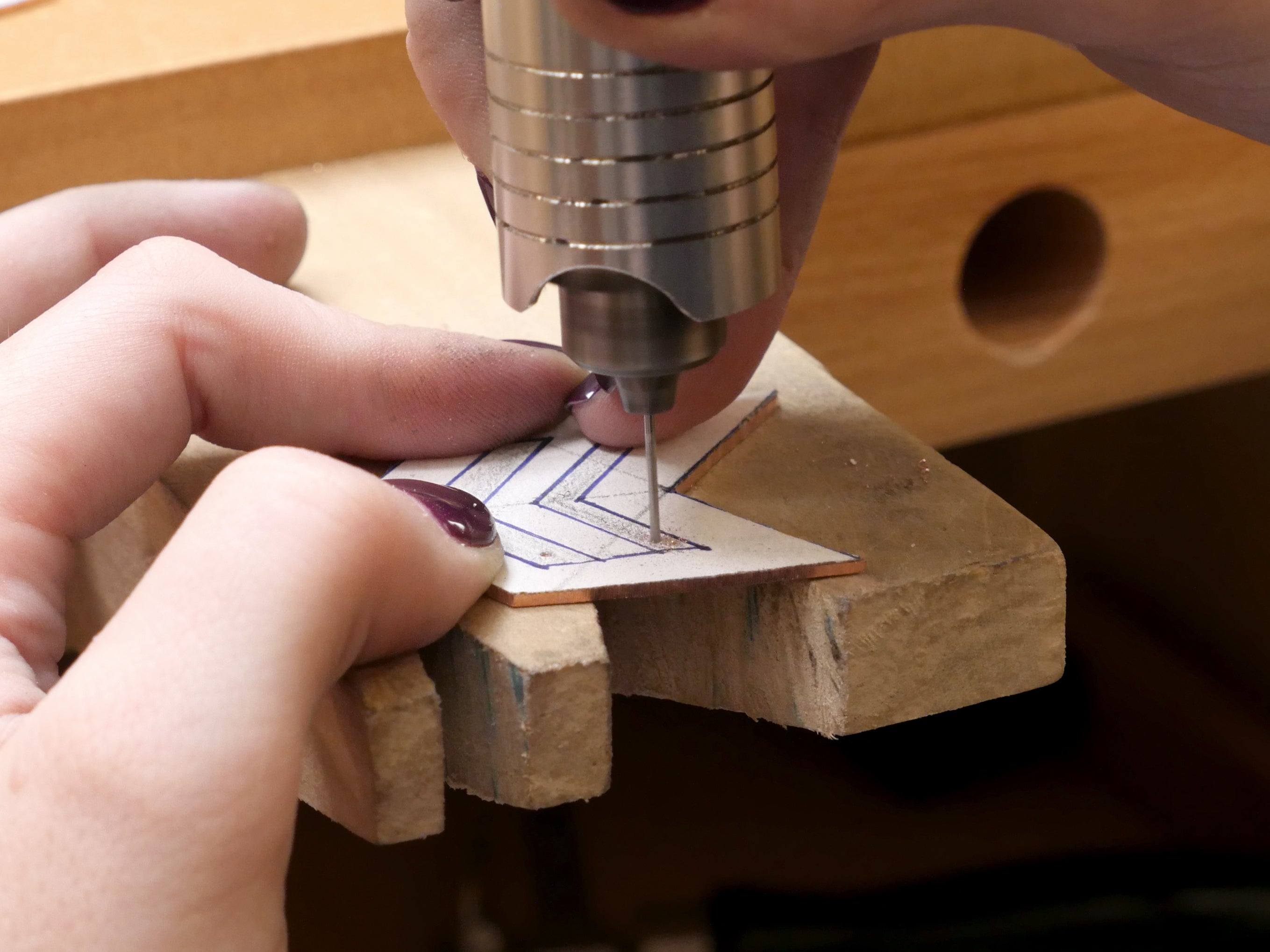 Set up your sheet metal with its glued-on template on your bench pin. This sturdy bit of wood with a V-cut is extremely helpful for piercing sheet metal, as it supports the metal on both sides of a cut.