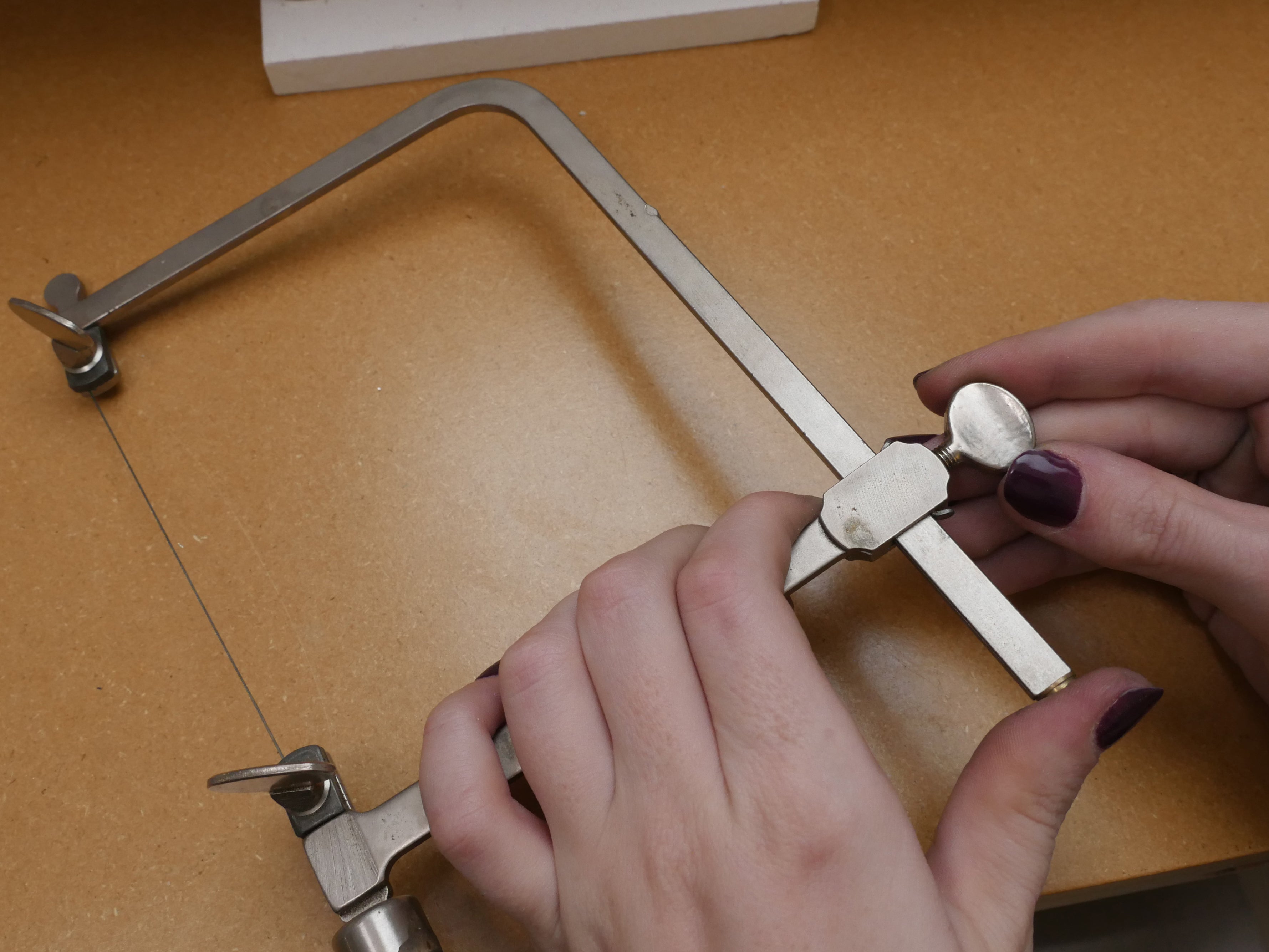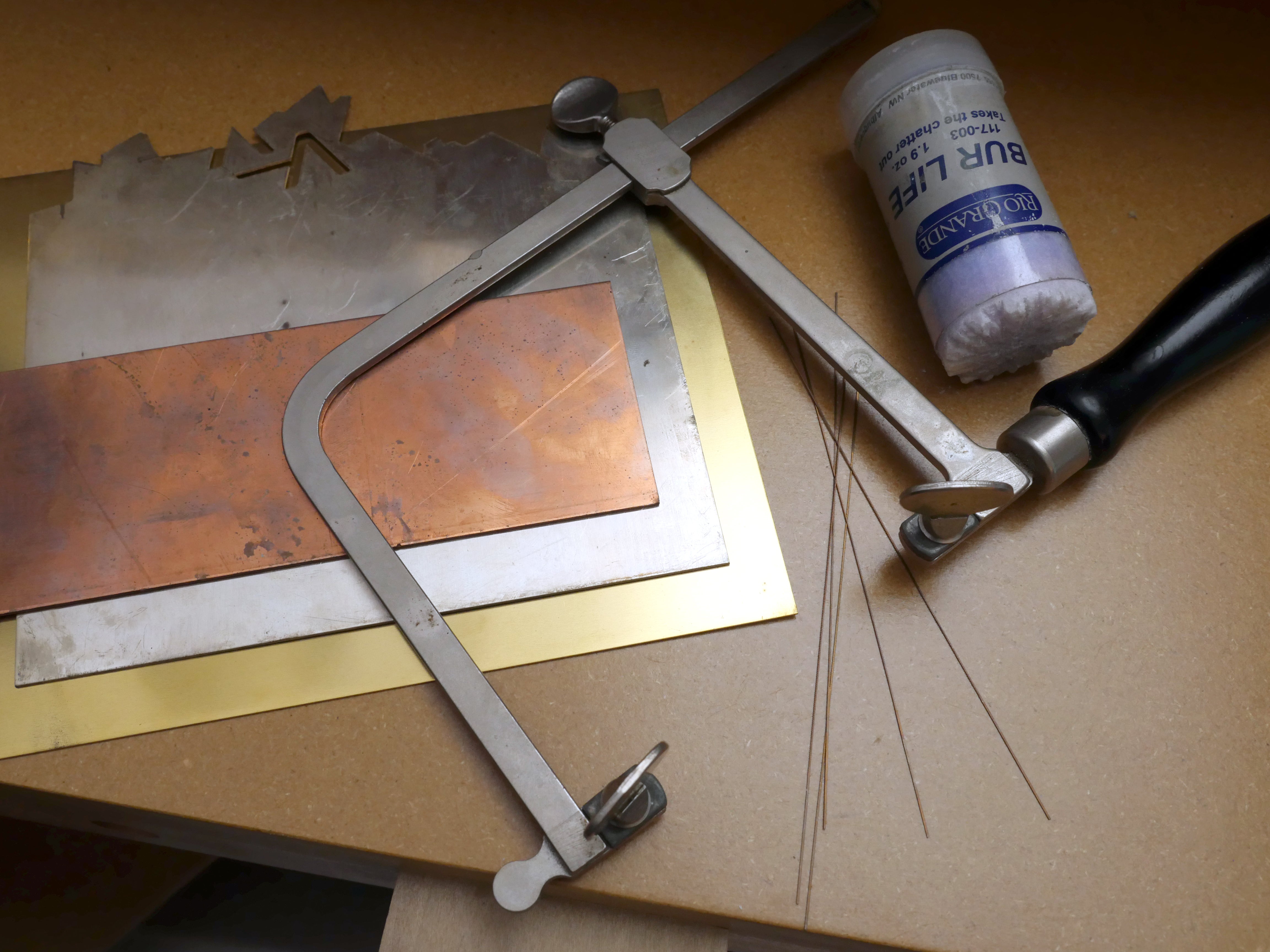 Grab your saw frame and secure the blade near the handle, but not at the other end. Thread the saw blade through the hole you drilled in the metal before securing and tensioning the blade in the frame. Now you can begin cutting (don't forget the bur lubricant) from inside the area to be removed to cut out the void.