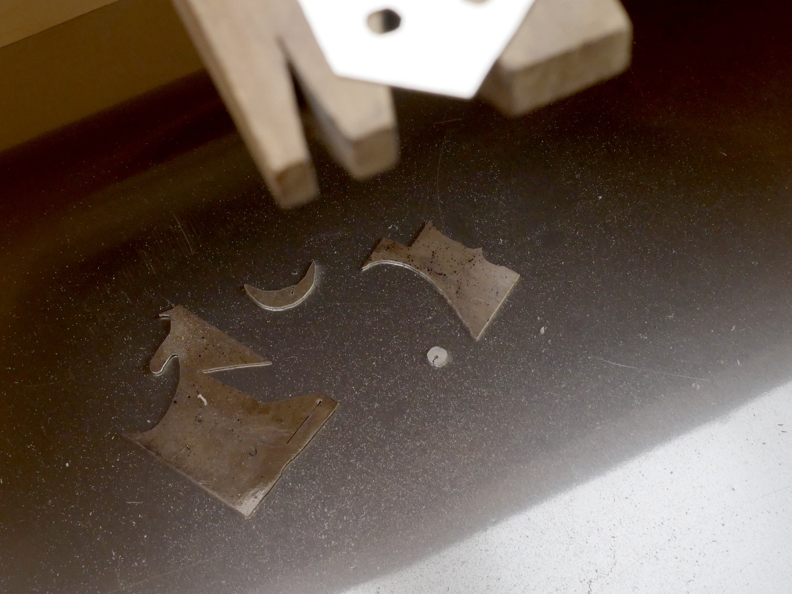 At first, it may be difficult to achieve a straight line, and that's perfectly normal! Try to err on the outside of the pattern lines, and you can always clean it up later with a file. Use a bench brush to sweep away shavings when they start to obscure your cut line.