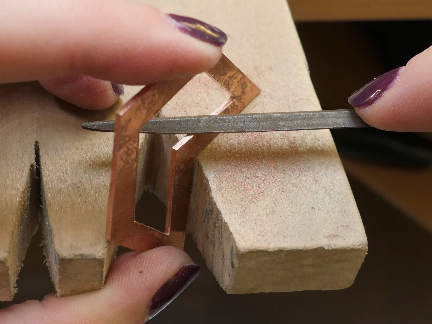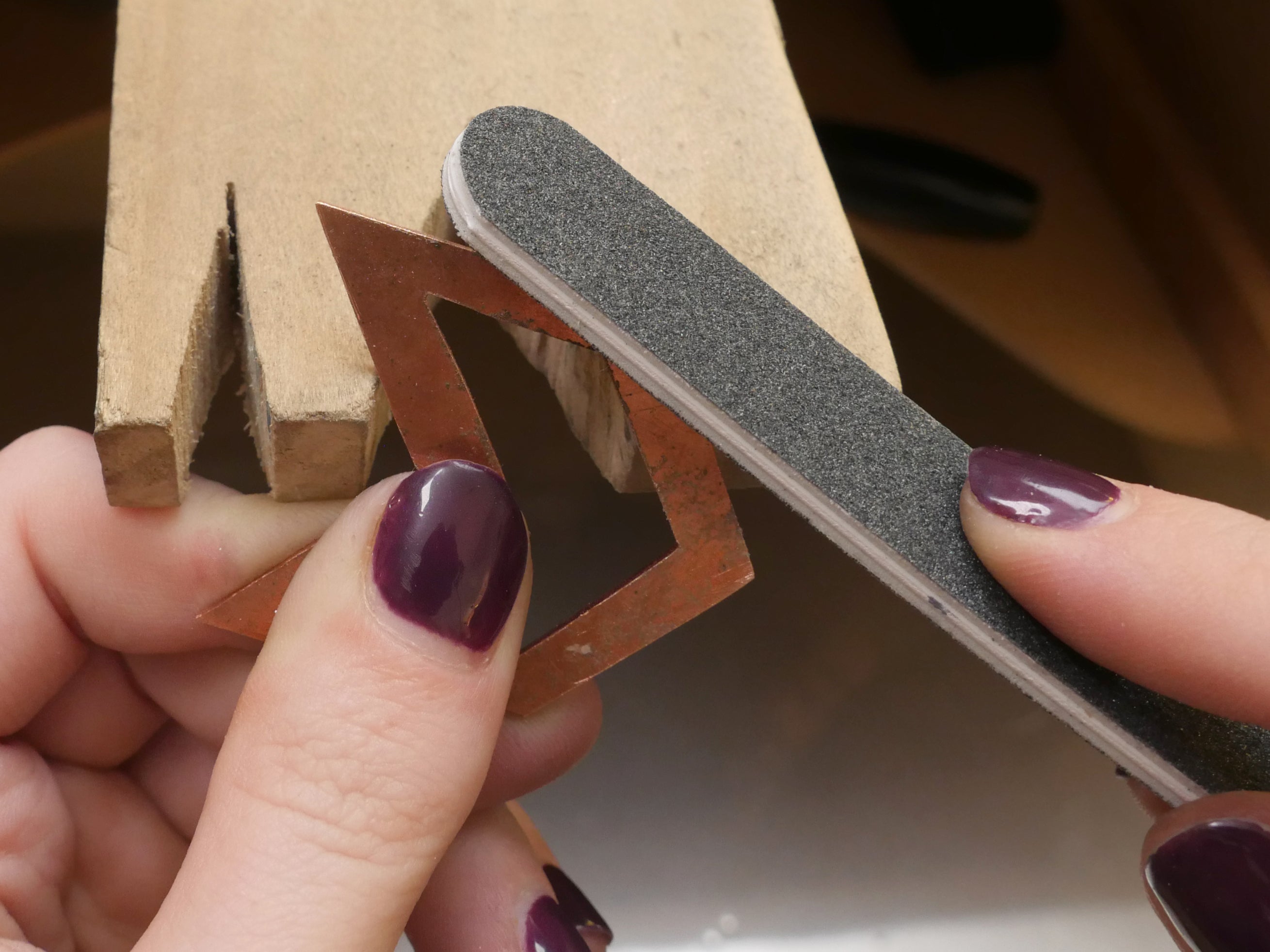 Once you've finished cutting out your shape, it's time to clean up the edges with a set of needle files. Most files are hardened steel with a tooth pattern cut into them, but when you’re shopping you might also see files covered in diamond grit. Reserve your files for use on soft metals only, as filing steel will quickly dull the teeth and reduce their effectiveness. These files cut on the push stroke, so you should only apply downward pressure on the file when pushing it away from you, and release the pressure for the pull stroke. Use the different areas of your bench pin to brace the metal for filing, and try to avoid positions that brace the metal against your hand.