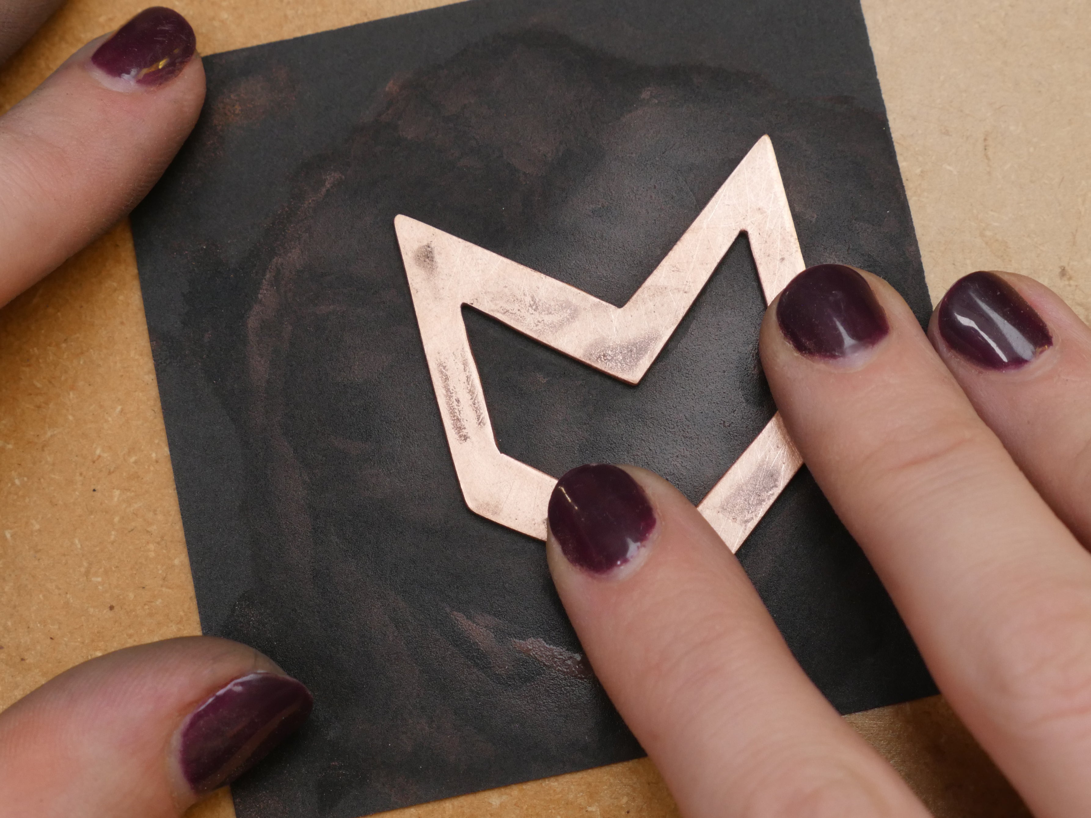 Now's also the time to decide what this workpiece will become, if you haven't already. To make a pendant, punch and drill two small holes near the upper points of the chevron. To create a keychain, create just one hole, but make it a bit larger. File away any burs left from drilling and resume the beginning of the sanding process.