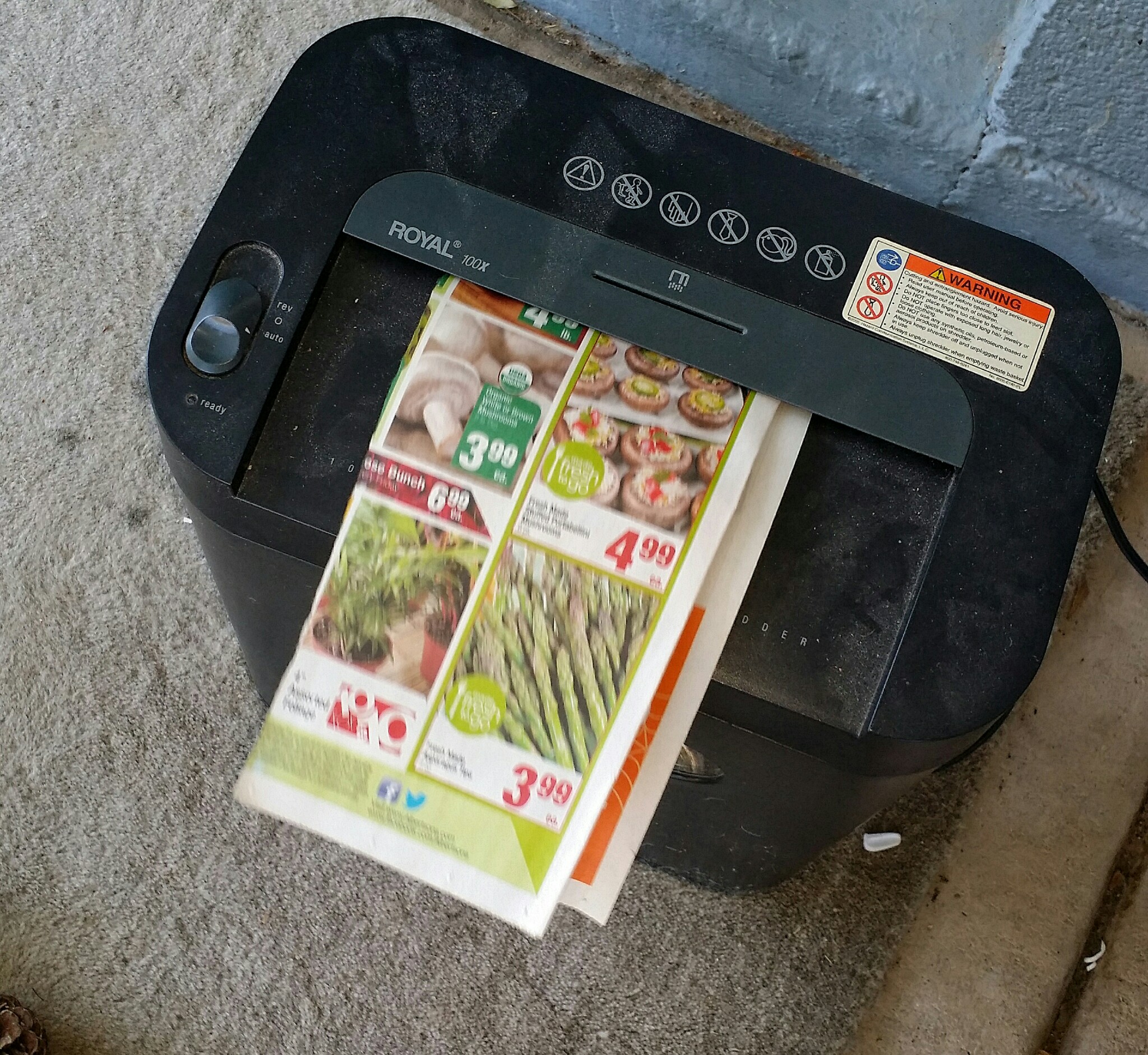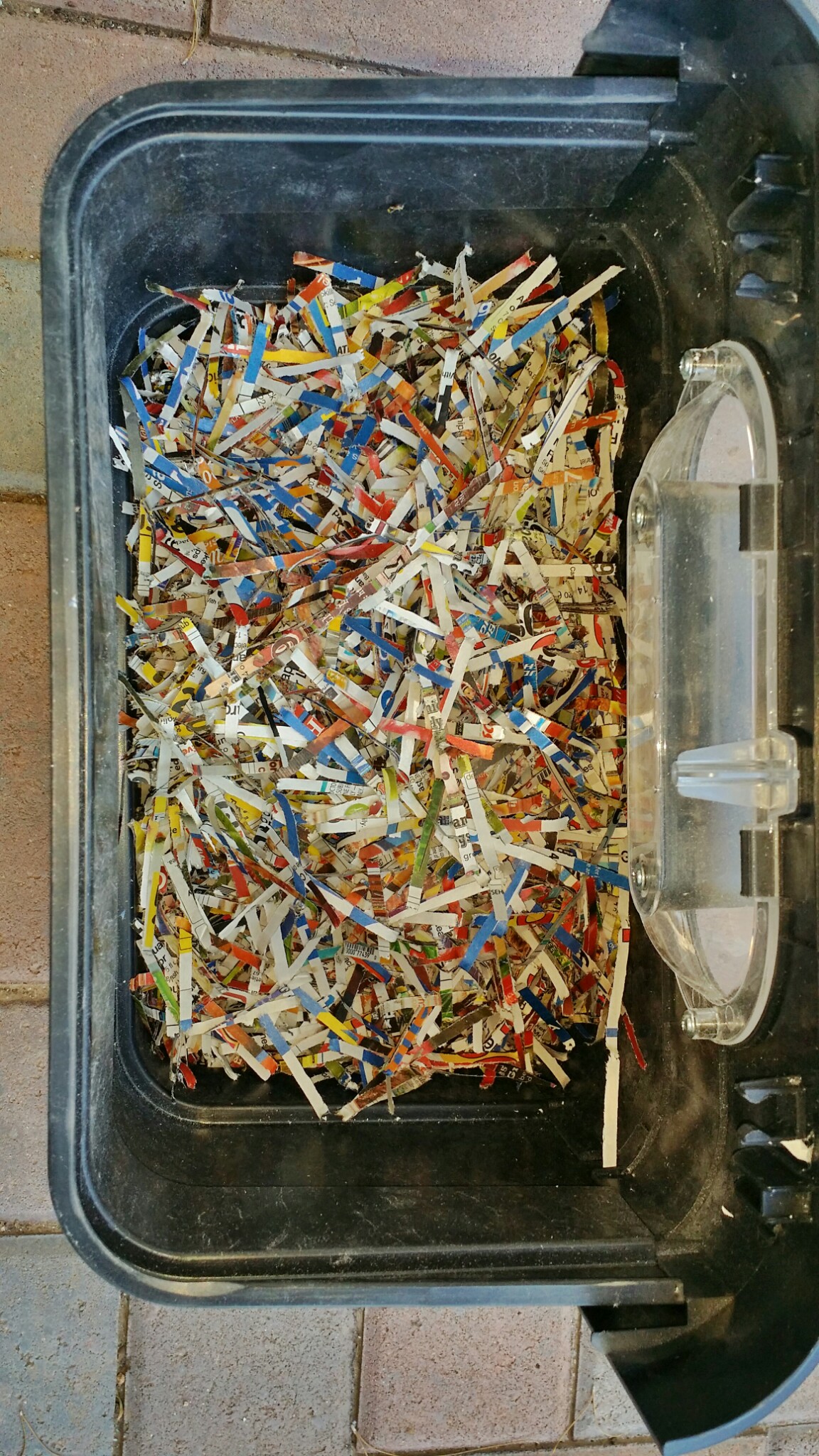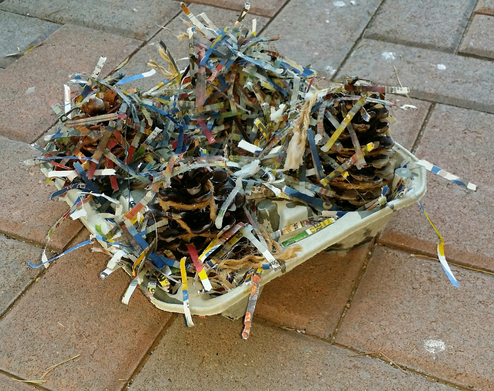 I strolled the perimeter of the yard and gathered this weeks crop of pinecones. Next was to recycle the weekly ads in the paper shredder to get fire-friendly tidbits of tinder to coat the pinecones with.