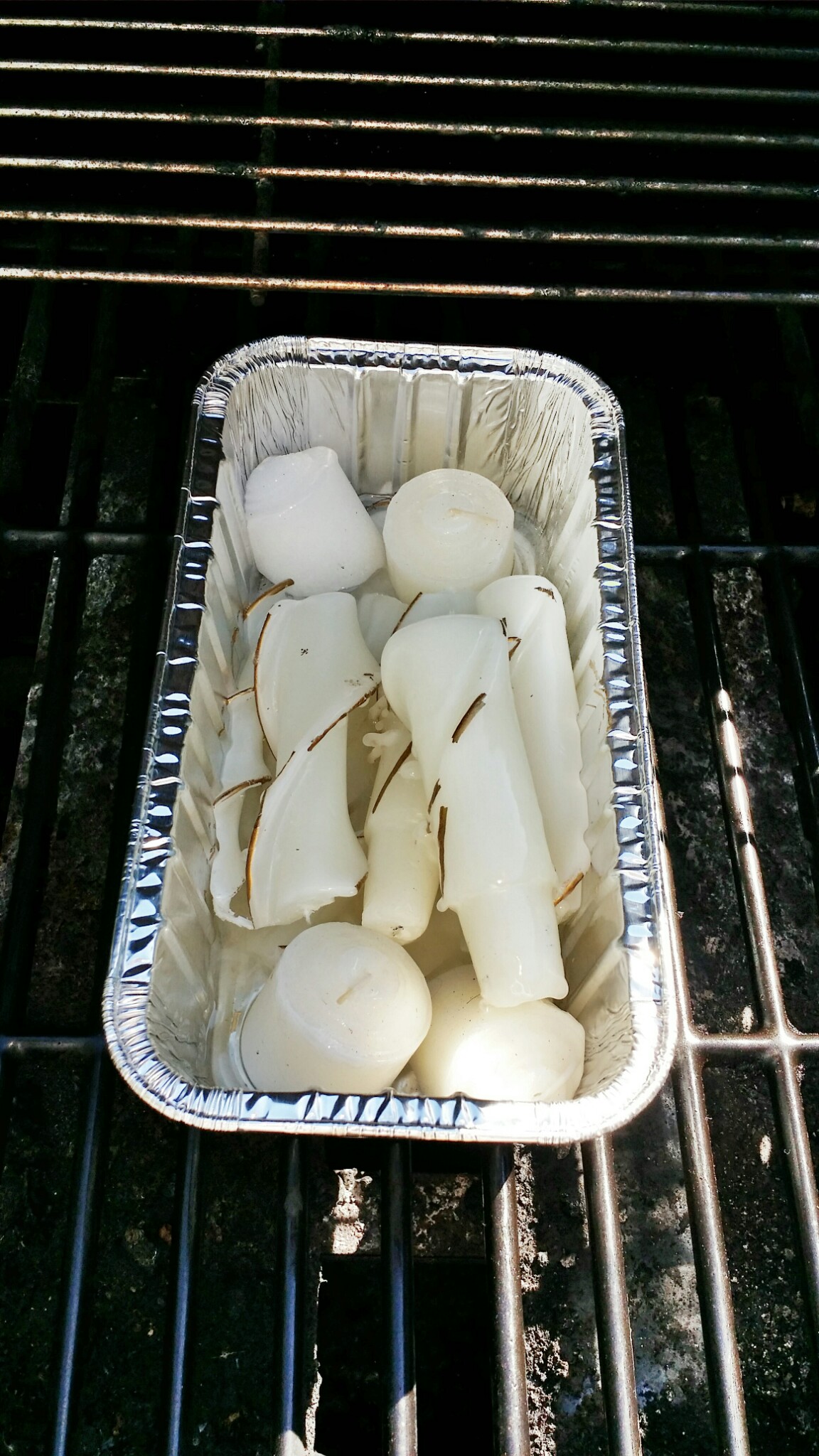 Now, fire up the grill and melt down the $0.25 boxes of candles into a little aluminum loaf pan. 300 degrees was plenty to cook them down in about 10 minutes. Reduce heat to a simmer and offset the pan away from direct flame to let it cool back down slightly.